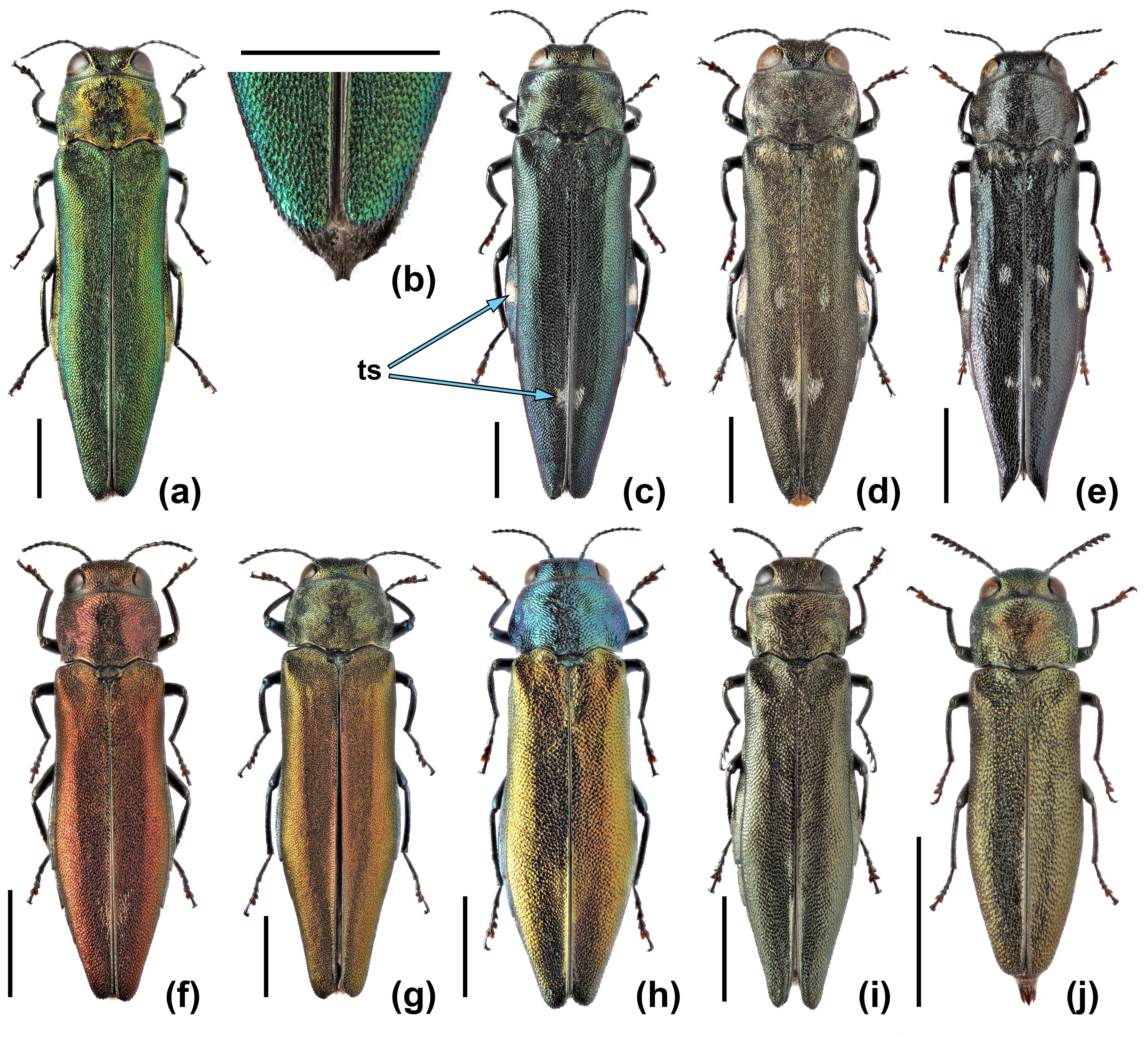 Картинка: взрослые жуки рода узкотелых златок. A-b – ясеневая изумрудная узкотелая златка, c-j – европейские представители рода узкотелых златок. Источник: Алексей Ковалев