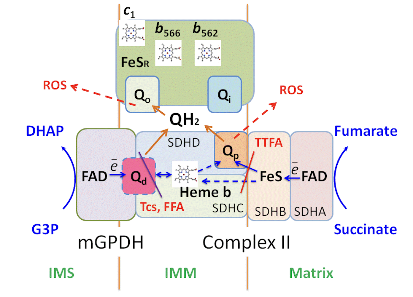 Предлагаемая модель формирования общего сайта связывания коэнзима Q комплексом II и mGPDH, и его участия в окислении субстратов (глицерол-3-фосфата и сукцината) и продукции активных форм кислорода (ROS). Источник: авторы исследования