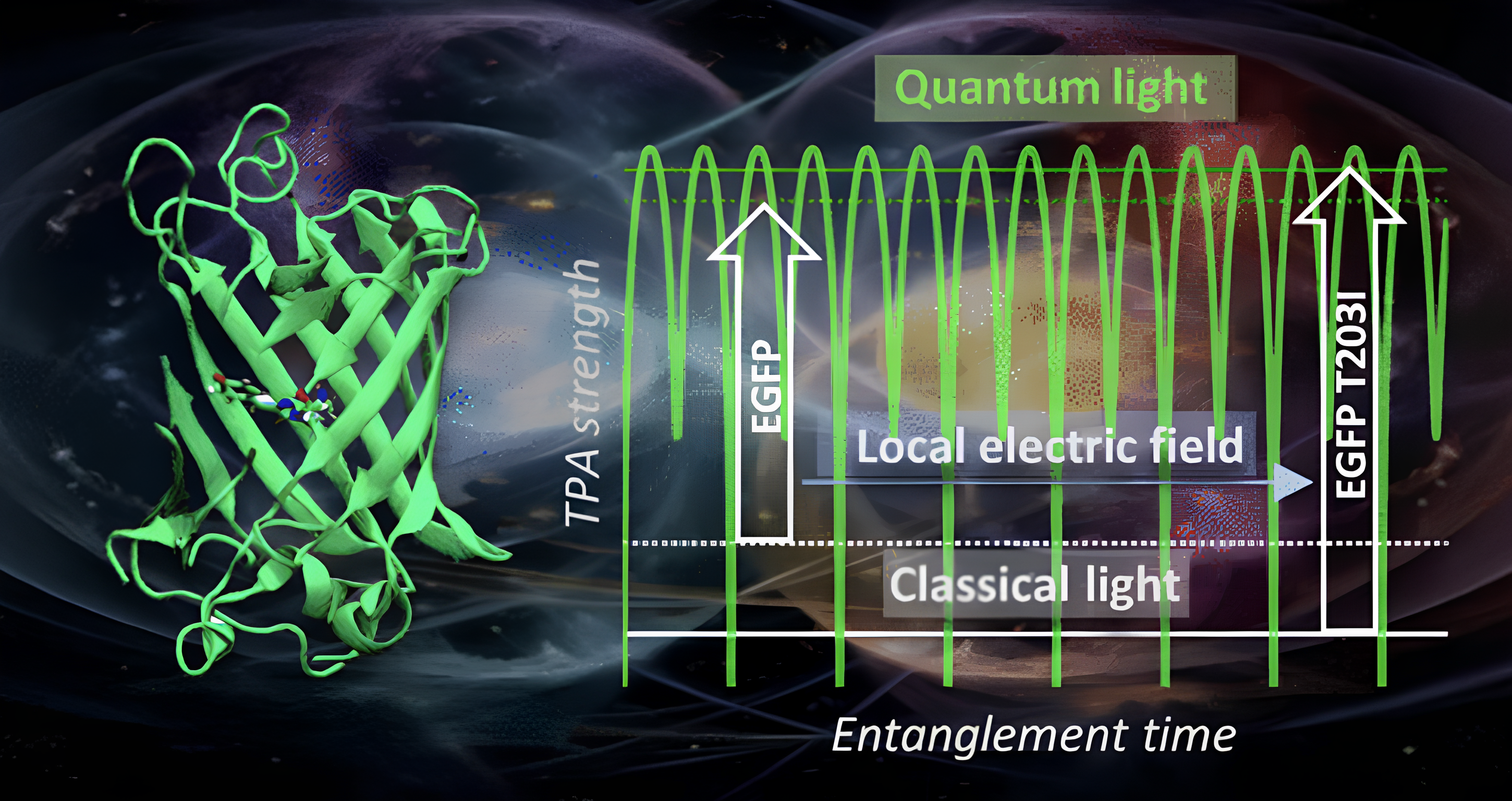 Двухфотонная спектроскопия с использованием запутанных фотонных пар активно развивается и в теоретическом, и в экспериментальном направлении. Квантовая запутанность описывает особую корреляцию в системах нескольких частиц. На практике такая корреляция позволяет проводить спектроскопические измерения с намного меньшими интенсивностями возбуждающего света, чем в классических экспериментах, что важно при проведении исследований in vivo. Главное, понимать физический смысл изменений, происходящих в случае поглощения запутанных и классических фотонных пар с полярными фотоактивными молекулами. К таким молекулам относятся флуоресцентные белки – генетически кодируемые биомаркеры, широко применяющиеся для визуализации и мониторинга состояния живых систем.
