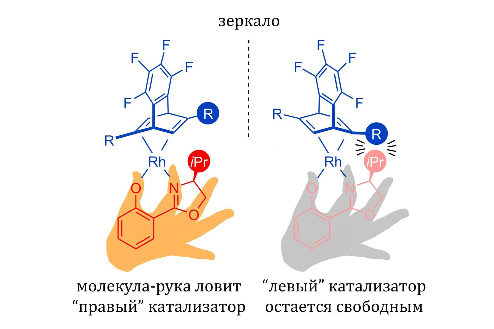 Авторы исследования предложили новый необычный способ получения «зеркальных» катализаторов. В его основе лежит разделение доступной смеси родиевых катализаторов на «правые» и «левые» молекулы. Из природной «левой» аминокислоты ученые синтезировали специальную молекулу-руку, которая схватывает только «правые» катализаторы и не трогает «левые». Такая избирательность обеспечивается отталкиванием между фрагментами молекул при попытке руки схватить «левый» катализатор. Ошибки сортировки случаются очень редко — не чаще чем в одном случае из двухсот. Полученные таким методом катализаторы доступнее и разнообразнее, чем их японские аналоги.