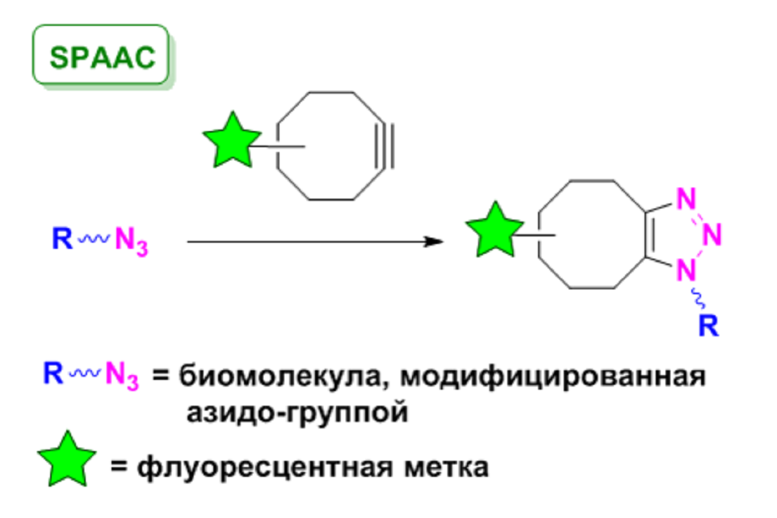 SPAAC — это биортогональная клик-реакция, то есть реакция, которая способна протекать в живых клетках, но при этом не вредит им и сама не подвержена влиянию со стороны живых систем.