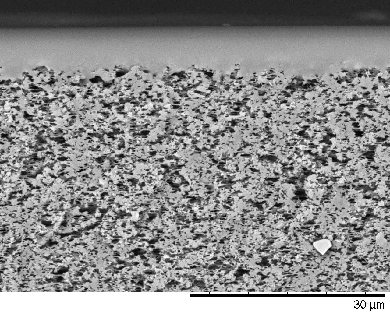 Картинка: фото поперечного сечения разработанной мембраны, сделанное с помощью сканирующего электронного микроскопа (справа). Рисунок предоставлен авторами работы. Источник: Grushevenko et al. / Russ. J. Appl. Chem., 2020