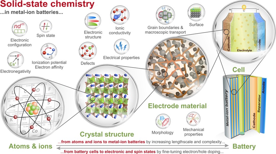 В обзоре, опубликованном в журнале Nature Communications, приводится краткое описание фундаментальных принципов и основных закономерностей в химии материалов для металл-ионных аккумуляторов, а также обсуждаются последние достижения в области создания электродных материалов и твердых электролитов с демонстрацией взаимосвязей между химическим составом, кристаллической и электронной структурами и электрохимическими свойствами материала. В обзоре особо подчеркивается важнейшая роль современных методов анализа, основанных на дифракции, визуализации высокого разрешения и спектроскопии, которые целесообразно использовать в сочетании с классическими подходами химии твердого тела в целях улучшения свойств материалов для аккумуляторов и, как следствие, создания новых направлений для дальнейших исследований.