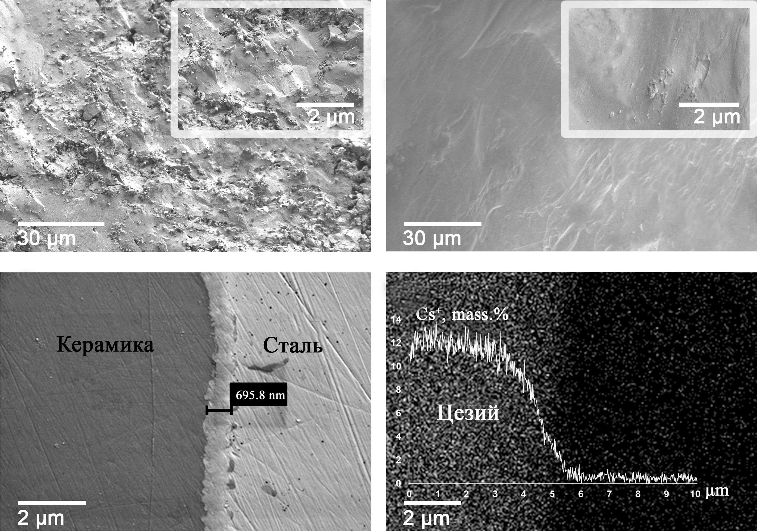 Картинка: изображение плотных матриц, содержащих радиоцезий, полученных в виде активных зон в конструкции источника ионизирующего излучения закрытого типа по специальной технологии при различных температурах; изображение места контакта сердечник-сталь и ЭДС-микроанализ на распределение цезия в данной конструкции в масс. Источник: ИХ ДВО РАН