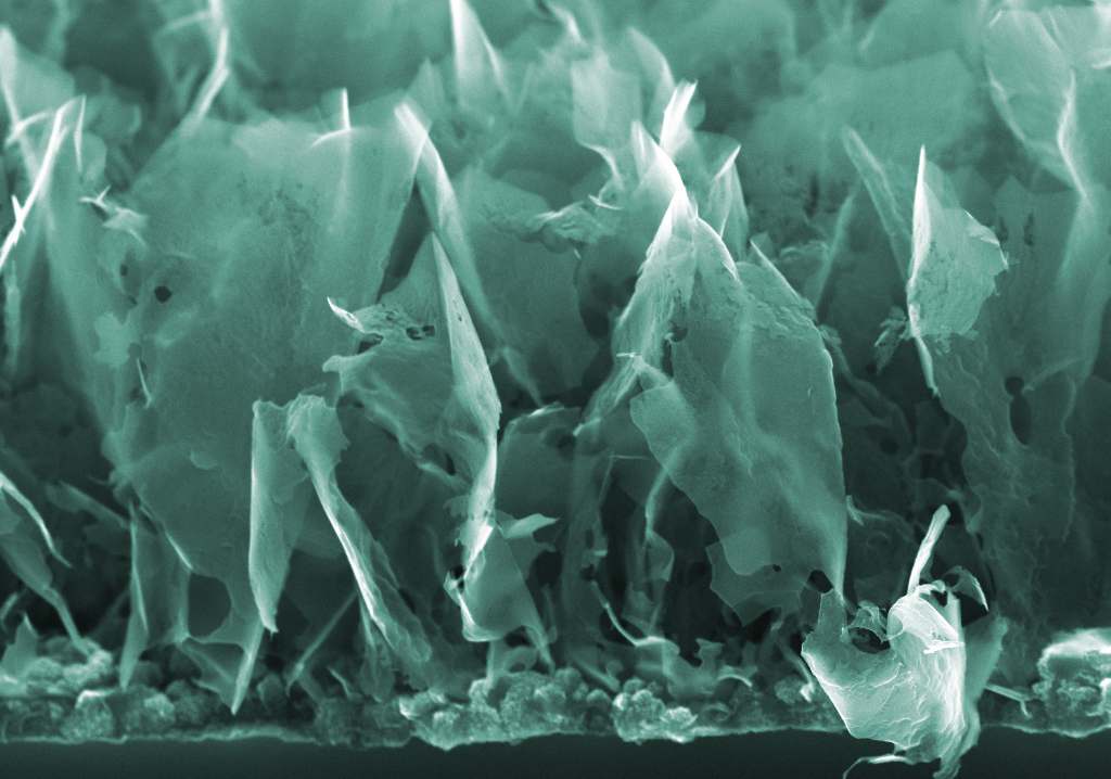 В последние годы ученые активно работают над созданием суперконденсаторов на базе различных наноматериалов, в том числе и так называемых углеродных наностенок – «стопок» из 10-15 листов графена, двумерного углеродного материала. Один из главных препятствий для их ускоренного внедрения в промышленное производство накопителей энергии является то, что наностенки отличаются относительно низким соотношением емкости и площади поверхности.