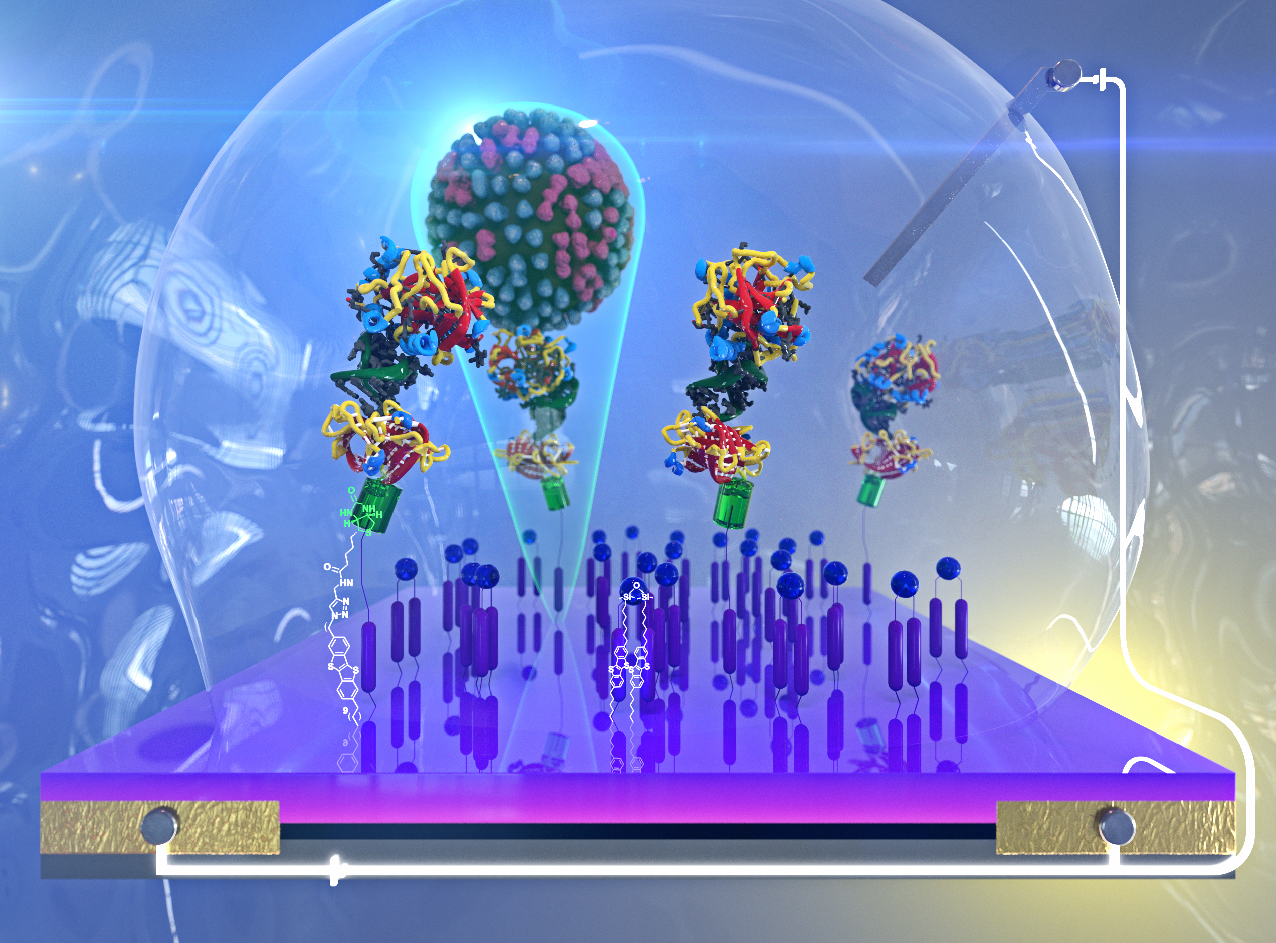 Чтобы проверить зависимость электрических свойств распознающего слоя от структуры молекул, которые нанесены на пиксели, химики использовали соединение, основу которого составляли специально спроектированные и синтезированные молекулы. Это так называемые биотиновые якоря: они выступают как рецепторы на поверхности полупроводников и сохраняют свойства при попадании в биологические жидкости. Устройство с таким слоем помещали в буферный раствор, в котором оно стабильно работало, что говорит о потенциальной возможности выявления антигенов в биологических средах.