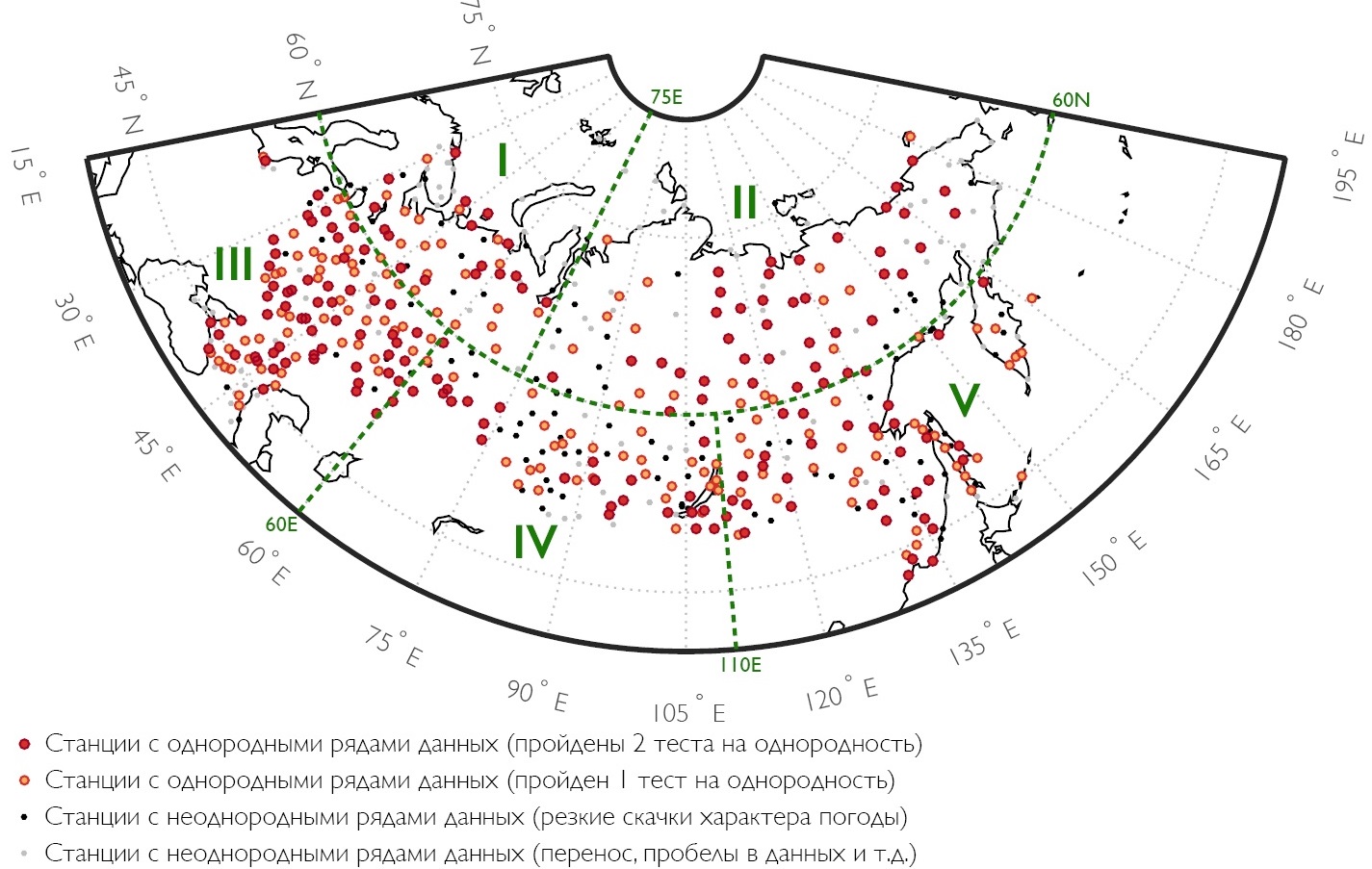 Картинка: расположение метеостанций, используемых в исследовании. Красным и оранжевым обозначены станции с однородными рядами данных. Источник: Александр Чернокульский