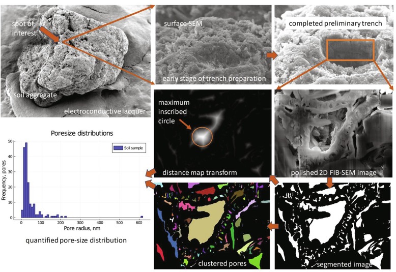 Ключевым для дальнейшего анализа является получение двухмерных данных и их совмещение в объемную картинку. Для этого необходимо срезать часть образца и очистить строго двухмерный срез, чтобы увидеть подробности его внутреннего строения. Ионный луч (ИО)— инструмент, позволяющий аккуратно снимать только верхний слой частичек вещества. Такое травление ионным пучком помогает открыть внутреннюю структуру даже самых хрупких и пористых образцов. Совместив две методики — ИО и СЭМ, российские геофизики смогли подробно проанализировать внутреннюю структуру почвенных образцов и впервые количественно описали пористость почвы на наноуровне.