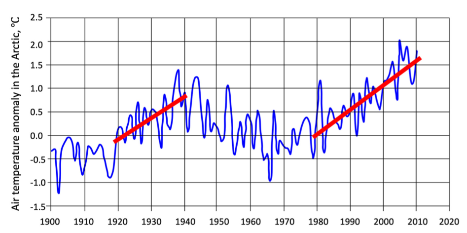 В Арктике одной из причин повышения температуры считается выделение метана из газогидратов и мерзлых пород в шельфовой зоне. В истории наблюдений за климатом Арктического региона есть два периода резкого повышения температуры: 1920–1930-е годы и начавшийся в 1980 году и продолжающийся сейчас.