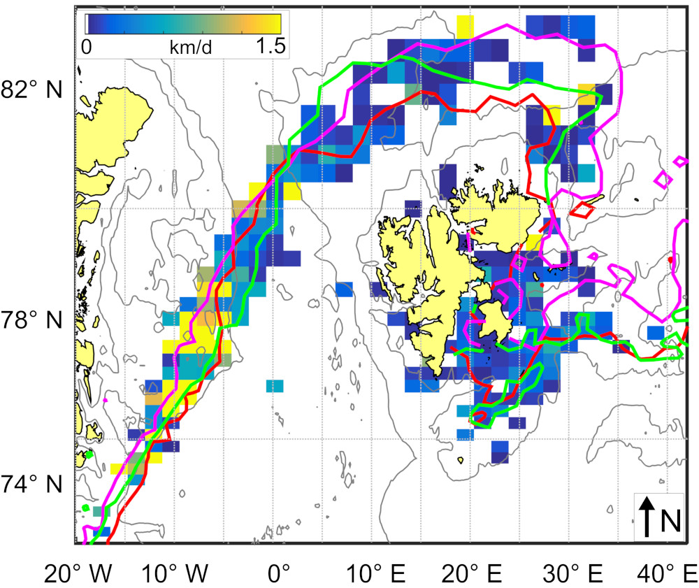 На основе полученной спутниковой информации и исторических экспедиционных данных ученым удалось сделать пространственную оценку горизонтального сокращения площади ледяного покрова в прикромочной ледовой зоне. В среднем, площадь таяния составила 0.2-0.5 ± 0.02 км/день.