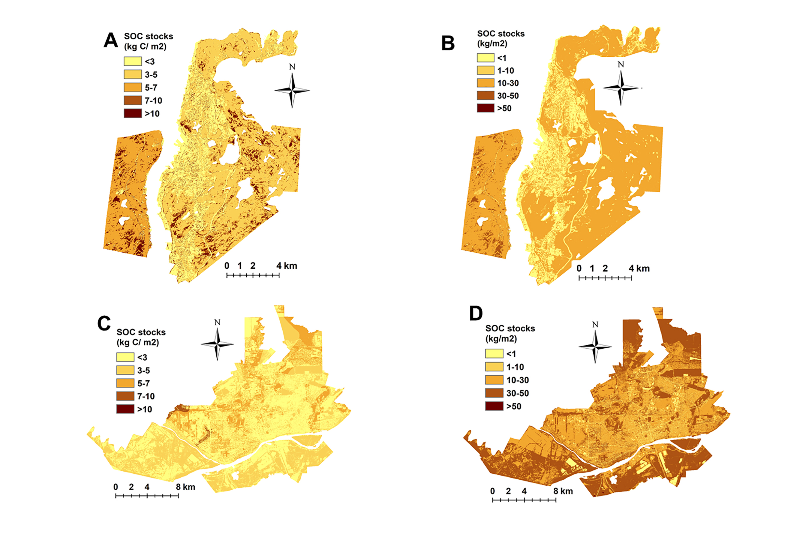 Оказалось, что для территории обоих городов запасы в первом метре почвенного профиля значительно увеличились, при этом для зоны лесотундры тенденция была заметно более выраженной, чем для зоны степей. В целом этот показатель по сравнению с соседними природными ландшафтами вырос примерно на 50-70%, причем в некоторых регионах северных городов этот показатель увеличился в три-четыре раза.