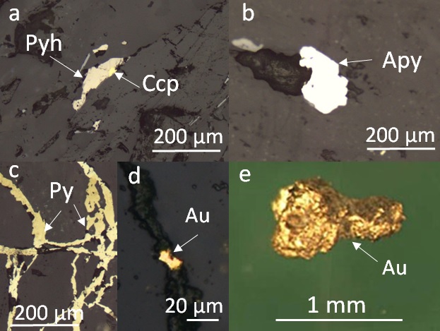 Компоненты руды из Кондуякского золоторудного месторождения: Pyh — пирротин; Apy — арсенопирит; Py — пирит; Au — самородное золото. Источник: Elena Shaparenko et al. / Minerals, 2025