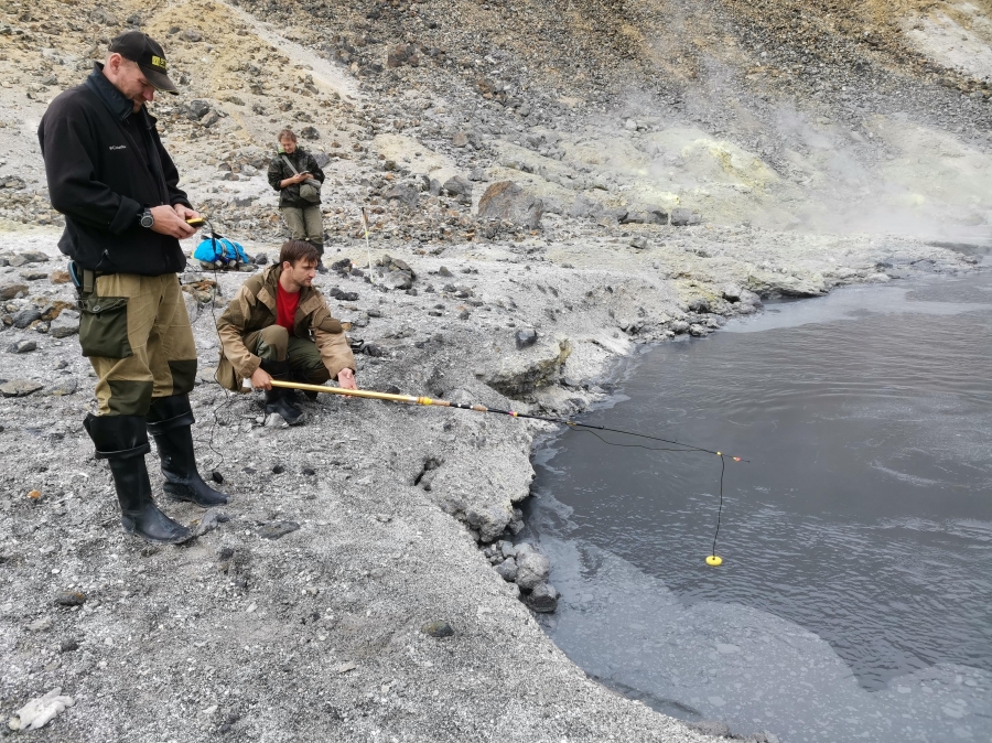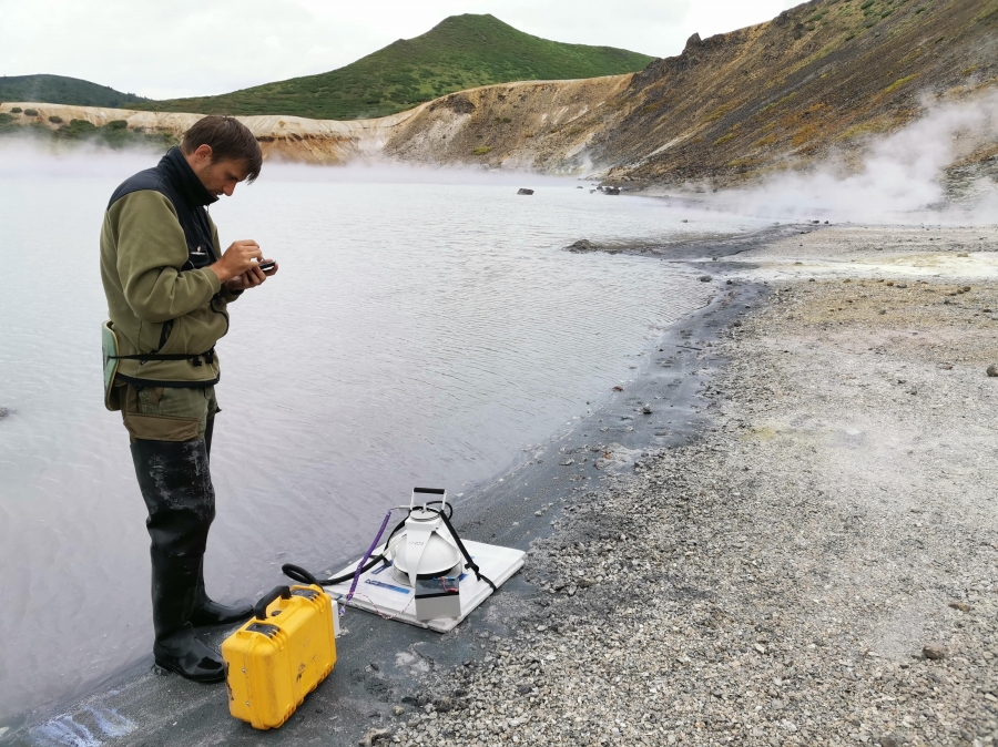 Вместе с сотрудником заповедника "Курильский" Еленой Линник мы начали совместную работу по мониторингу Кипящего. Я думаю, это эта работа поможет выявить закономерности глубинной жизни озера. Также в этом году мы определили, какие из термальных полей в кальдере наиболее зависимы от местных гидрологических условий. Интересные моменты всплыли и при определении диффузионного потока СО2, как на термальных полях, так и на озерах. Но обо всём этом говорить пока рано. В следующем году планируем продолжить работу, привезем с собой дополнительное оборудование. Далее о некоторых моментах тех работ, которые мы проводили по изучению вулканических газов, вам расскажут мои коллеги.