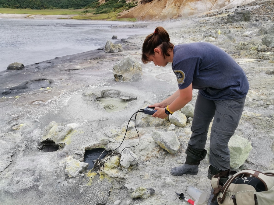 Основным направлением является изучение процессов взаимодействия подземных вод с вулканическими парами и вмещающими породами в недрах вулканических построек. В случае попадания магматических летучих (в первую очередь, таких кислых, как HCl и SO2) в поверхностные водоносные горизонты, происходит превращение последних в агрессивные ультракислые растворы. Эти растворы способны превращать твердую горную породу в податливую мягкую глину и выносить на поверхность значительное количество породообразующих элементов (алюминий, железо, кальций и т.д.). Затем водотоки, дренирующие термальные поля, выносят их в морскую акваторию, оказывая влияние на океан. Кроме того, разрушение структуры пород под влиянием ультракислых вод может приводить к нарушению стабильности вулканической постройки, к возможным обрушениям, усилению эрозионных процессов и т.д. Наша задача - дать количественную и качественную оценку выносимых компонентов (как растворенных, так и свободно выделяющихся посредством фумарол или диффузии), а также оценить скорости эрозионных процессов посредством гидротермальной деятельности на разных вулканах Курильской островной дуги. Хочется отметить, что, если геохимия термальных вод Кунашира изучалась уже не одним поколением ученых (первые работы советских ученых проводились в 50-х годах прошлого 20 века), то съемка диффузионного потока вулканического CO2 на склонах вулкана Менделеева и в кальдере вулкана Головнина, а также изучение фумарольных и гидротермальных газов, используя дистанционные методы (мультигаз и DOAS) были выполнены здесь впервые.