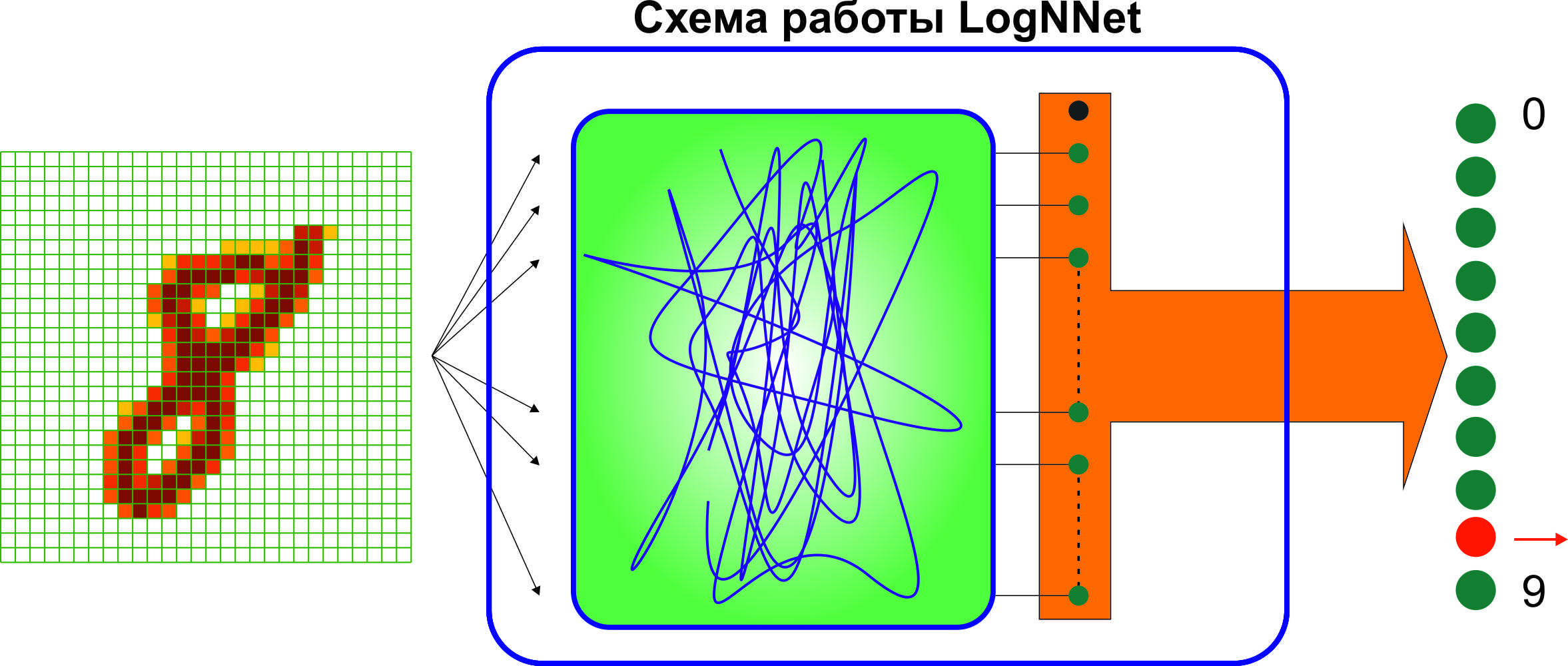 Чтобы решить эту проблему, ученый из Петрозаводского государственного университета Андрей Величко создал новую архитектуру нейронной сети, которая позволяет экономно использовать небольшие объемы оперативной памяти и открывает перспективы для внедрения маломощных устройств в интернет вещей. Она получила название LogNNet. Эта нейронная сеть прямого распространения, то есть сигналы в ней направлены исключительно от входа к выходу.