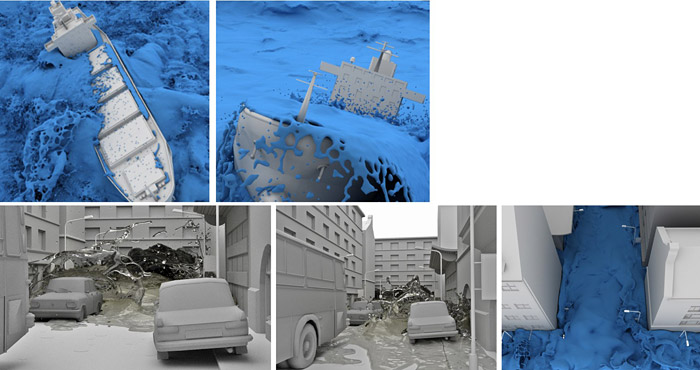 Картинки: перехлест волны через палубу корабля и затопление города водой, смоделированные с использованием алгоритма сглаженных частиц. Источник: Ihmsen M. et al., 2013