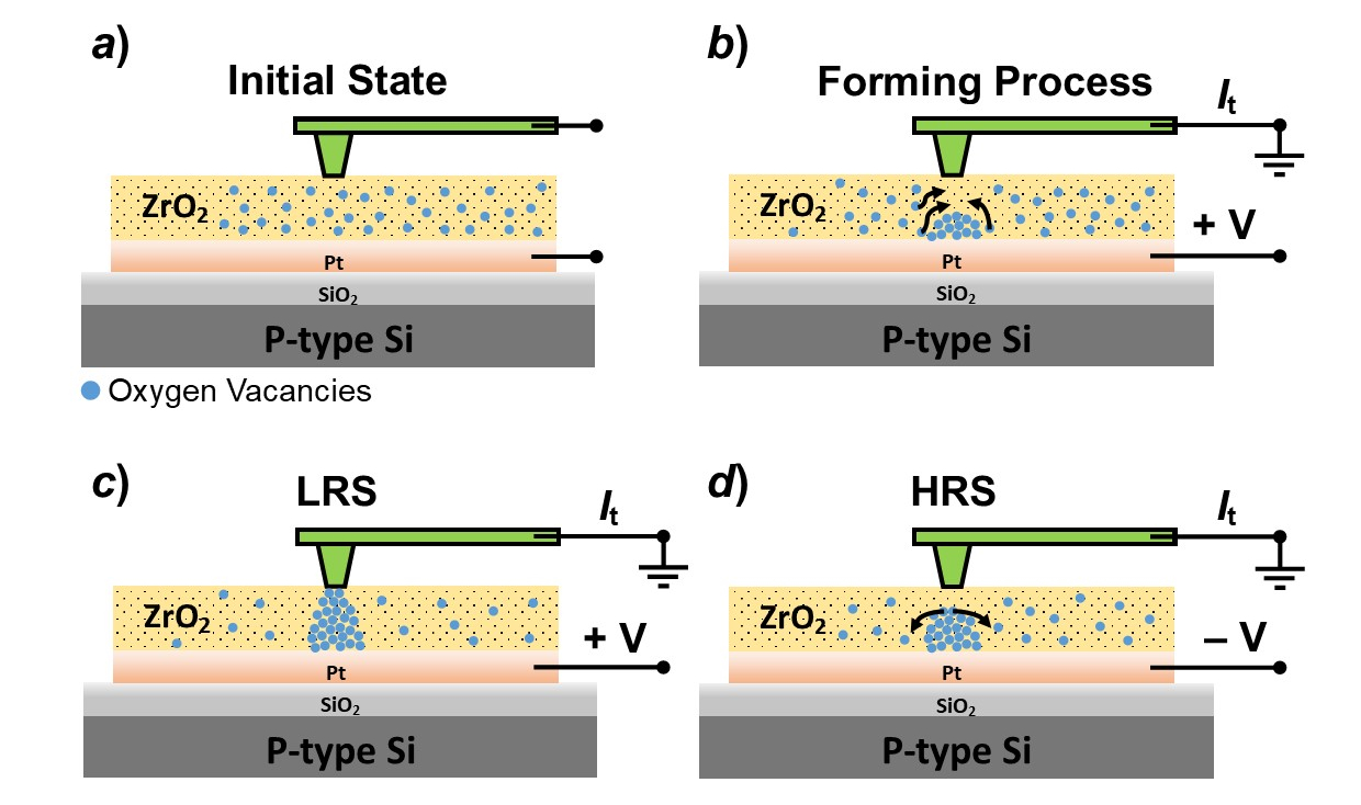Диоксид циркония в виде тонких пленок или наночастиц рассматривается в качестве нового материала для применения в электронике, например в устройствах энергонезависимой памяти (мемристорах), а также в транзисторах — элементах для усиления и преобразования электрических сигналов. Он хорошо совместим с кремнием, кроме того, его способностью проводить ток можно управлять, а это актуально для записи и хранения больших объемов информации. Последнее свойство обеспечивается тем, что в виде тонких пленок или наночастиц диоксид циркония несет большое количество кислородных вакансий — участков, в которых в кристаллической решетке «не хватает» атома кислорода и которые при определенном воздействии (высоком напряжении) могут вовлекаться в проведение тока. Однако широко диоксид циркония в чистом виде в электронике пока не используется из-за того, что получить материал с большим количеством кислородных вакансий сложно. Так, например, он стабилен при температурах выше 1100 °С, когда кристаллическая решетка диоксида циркония принимает так называемую тетрагональную фазу. При понижении температуры до комнатной материал возвращается в состояние с малым числом кислородных вакансий.