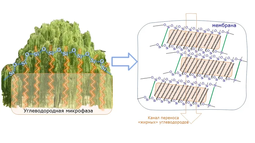 «Наши полимеры можно сравнить с ветвями плакучей ивы: они столь же гибкие и имеют похожее строение. У дерева с основной ветки свисают тонкие веточки, а в гребнеобразных полисилоксанах гибкие линейные углерод-углеродные цепочки (боковые заместители, или “гребни”) свисают с основной гибкой макроцепи»,— рассказывает руководитель проекта по гранту РНФ Владимир Волков, профессор, доктор химических наук, главный научный сотрудник лаборатории полимерных мембран ИНХС РАН.