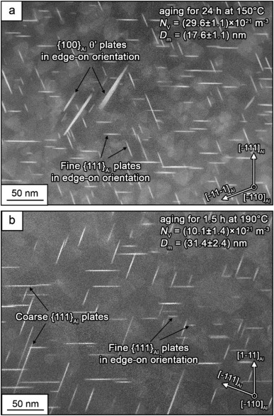 Рисунок 1. Микроструктура сплавов Al-Cu-Mg-Ag, после термической обработки при температуре 150°C (а) и 190°C (b). Источник: Gazizov et al. / Materials Characterization, 2022