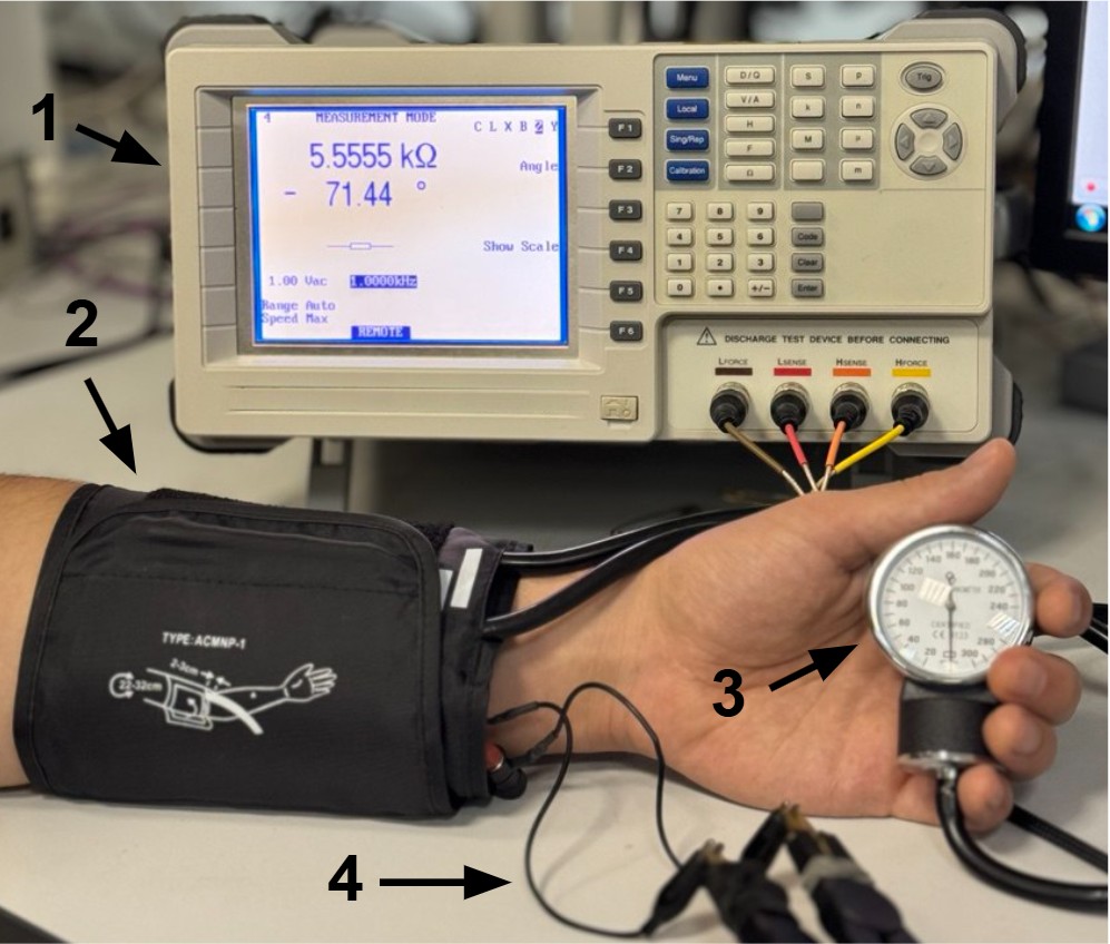 Внешний вид устройства для измерения зависимости импеданса от приложенного давления: 1 — анализатор импеданса, 2 — манжета для измерения артериального давления, 3 — манометр, 4 — электродные провода. Источник: Александр Герасименко