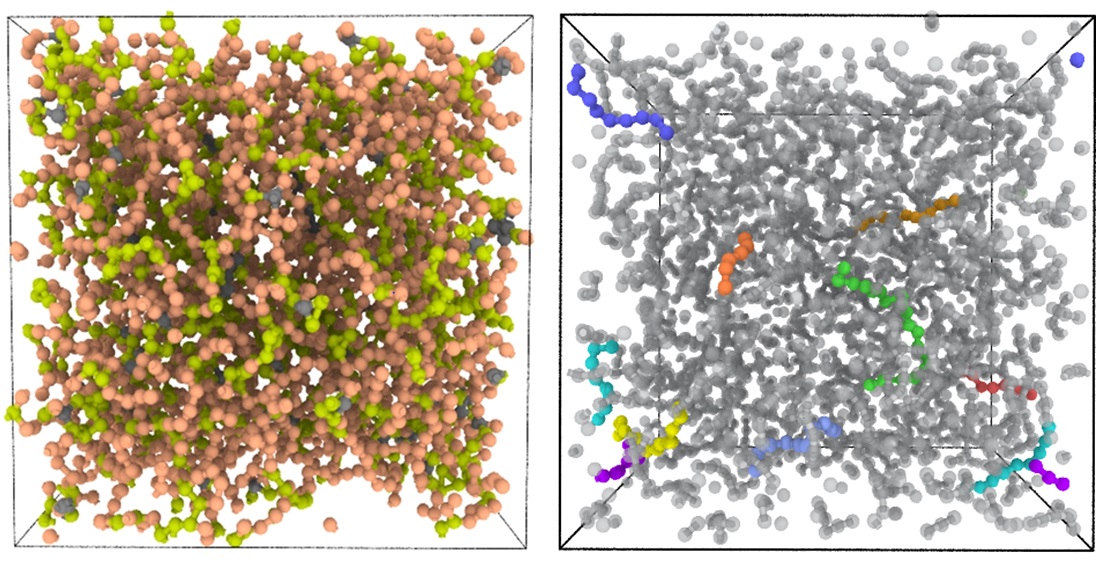 Атомистическая структура жидкого углерода: розовые атомы — sp-гибридизация, зеленые — sp2, серые — sp3 (слева). Примеры отдельных углеродных цепочек в объеме жидкости (справа). Источник: Carbon