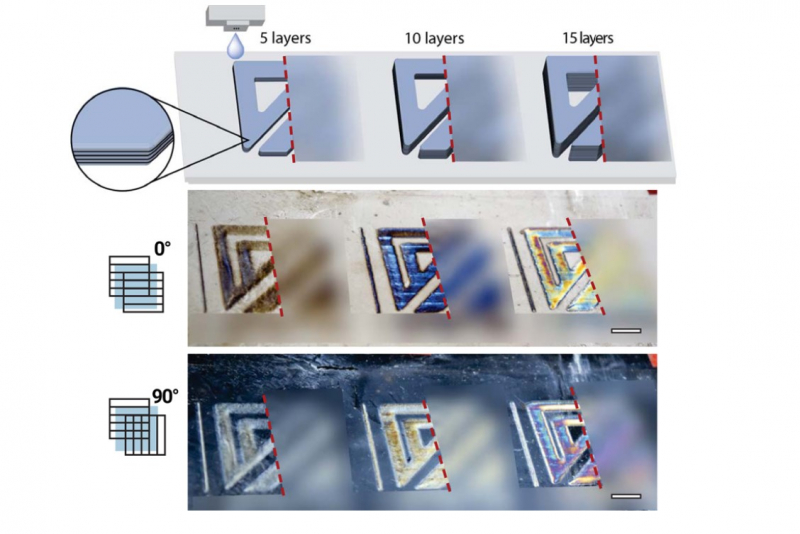 «Нам нужно было сделать так, чтобы с помощью струйного принтера можно было нанести на поверхность прозрачной подложки анизотропную оптическую структуру, то есть покрытие, в котором наночастицы целлюлозы закручиваются вдоль одной из осей и образуют так называемую хиральную нематическую структуру, ― рассказывает Александр Виноградов. ― Проще говоря, чтобы наноразмерные частицы в многослойной системе упорядочивались определенным образом относительно друг друга, а не произвольно распределялись бы между собой. Толщина покрытий, сформированная при осаждении чернил, выбирается таким образом, чтобы приводить к появлению интерференции в поляризованном свете. Таким образом, цветной оптический отклик напечатанного рисунка, прозрачного при дневном свете, можно с легкостью наблюдать при свете экрана смартфона или любого другого ЖК-экрана».