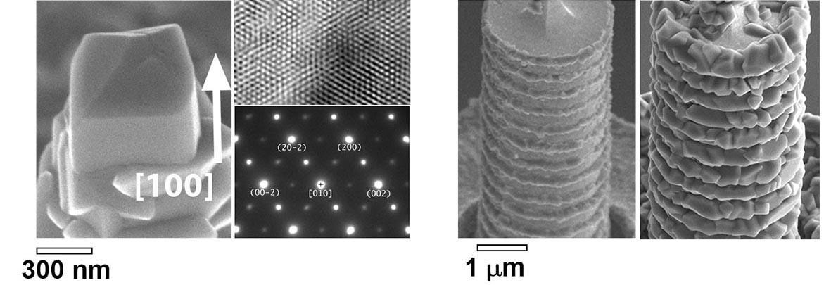 Слева: высококачественный монокристалл VO2 , синтезированный на вершине кремниевой иглы и результаты исследований его атомной структуры. Справа: упорядоченные массивы наноколец VO2, селективно синтезированных на поверхности цилиндров, вытравленных из кремния с помощью Бош-процессов. Источник: Sergey V. Mutilin et al / CrystEngComm, 2020