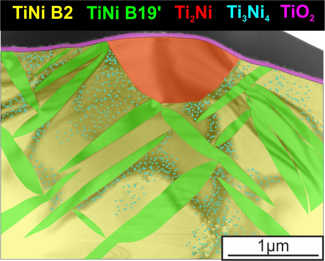 Микроструктура пористого сплава на основе TiNi с добавкой Ti. Обнаруженные фазы отмечены различными цветами: TiNi(B2) – желтый, TiNi(B19′) – зеленый, Ti2Ni – красный, Ti3Ni4 – голубой, TiO2 – пурпурный. Источник: пресс-служба СФТИ ТГУ