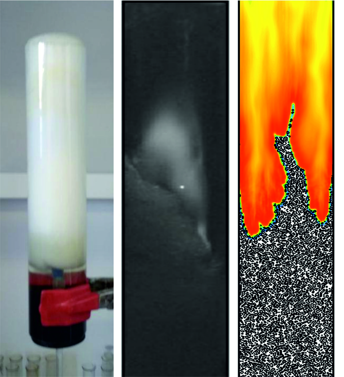 Фото: слева – реактор, заполненный вспененной эмульсией; посередине – фронт пламени, распространяющийся во вспененной эмульсии; справа – расчетное поле температуры во фронте пламени. Источник: Борис Кичатов
