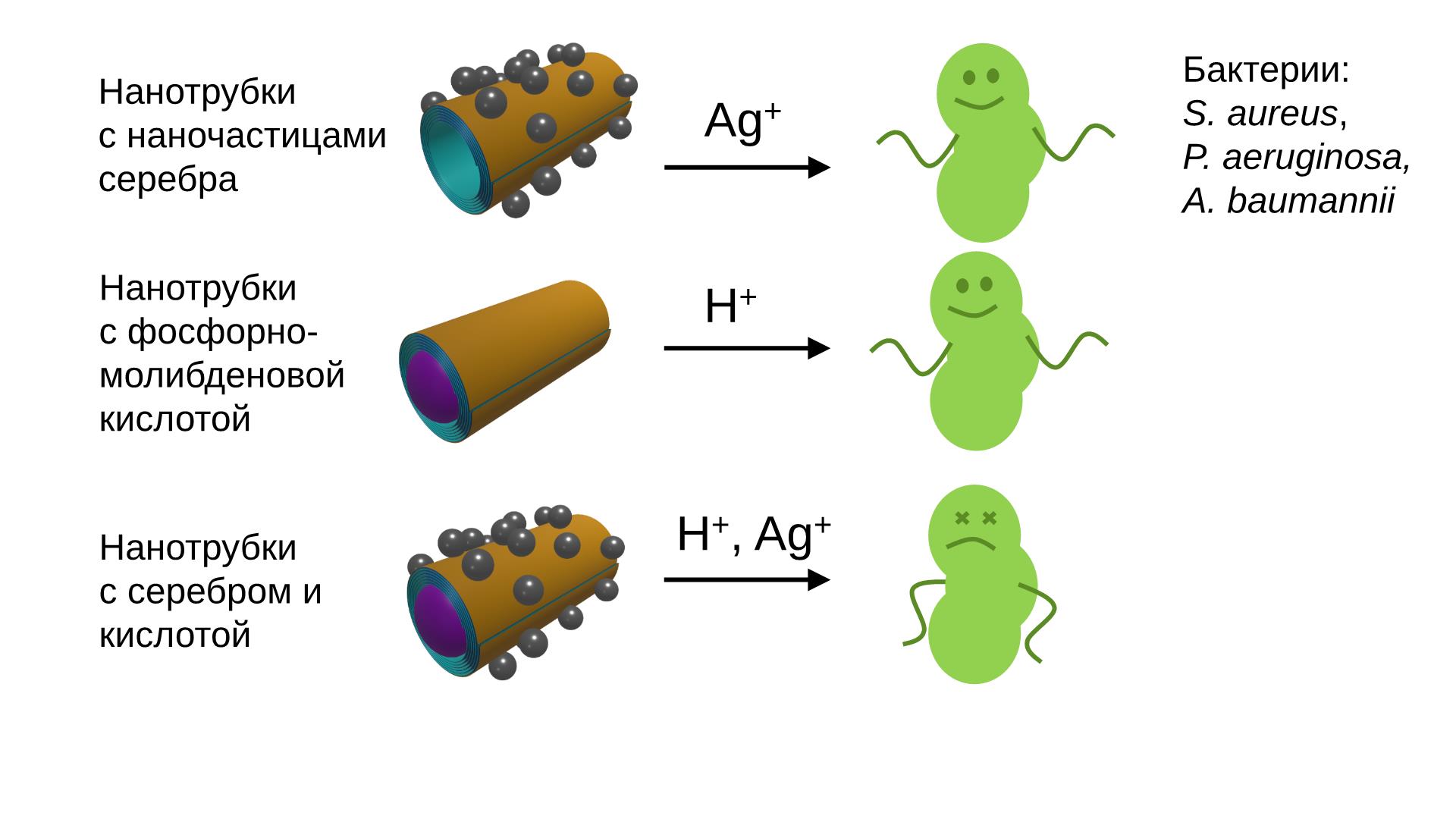 предложили новый метод получения антимикробных материалов. За основу были взяты серебро и фосфорномолибденовая кислота. Ионы серебра способны связываться с ферментами бактерий, нейтрализующими активные формы кислорода, и вызывать гибель клеток из-за окислительного стресса. А кислота подавляет способность бактерий производить защитные ферменты и противостоять действию ионов серебра. На поверхность нанотрубок ученые нанесли наночастицы серебра, а в их полость загрузили кислоту. Антимикробный эффект проявлялся только при сочетании компонентов и при смачивании – именно тогда происходит постепенное высвобождение кислоты и ионов серебра. Минимальное количество материала способно подавить такие микробы, как Staphylococcus aureus (золотистый стафилококк), Pseudomonas aeruginosa (синегнойная палочка) и Acinetobacter baumannii («иракибактер»)