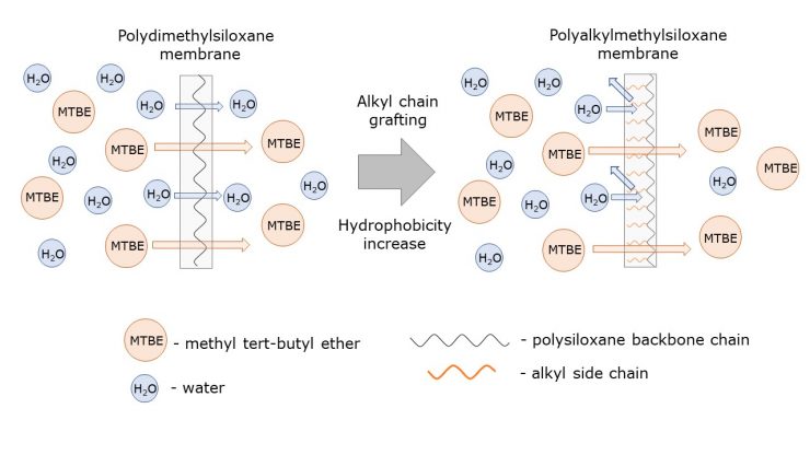 «Простота синтеза силиконовых каучуков предложенным методом позволяет «играючи» изменять количество атомов углерода в составе групп, привитых к основной полимерной цепи, от одного до четырнадцати, что позволяет «тюнинговать» мембраны для селективного выделения тех или иных веществ из воды. Таким образом можно оптимизировать свойства мембран под конкретную задачу. Например, при помощи силиконовых мембран нам удалось избирательно извлечь из водных растворов метил-третбутиловый эфир со степенью разделения, превосходящей все существующие мировые аналоги.
