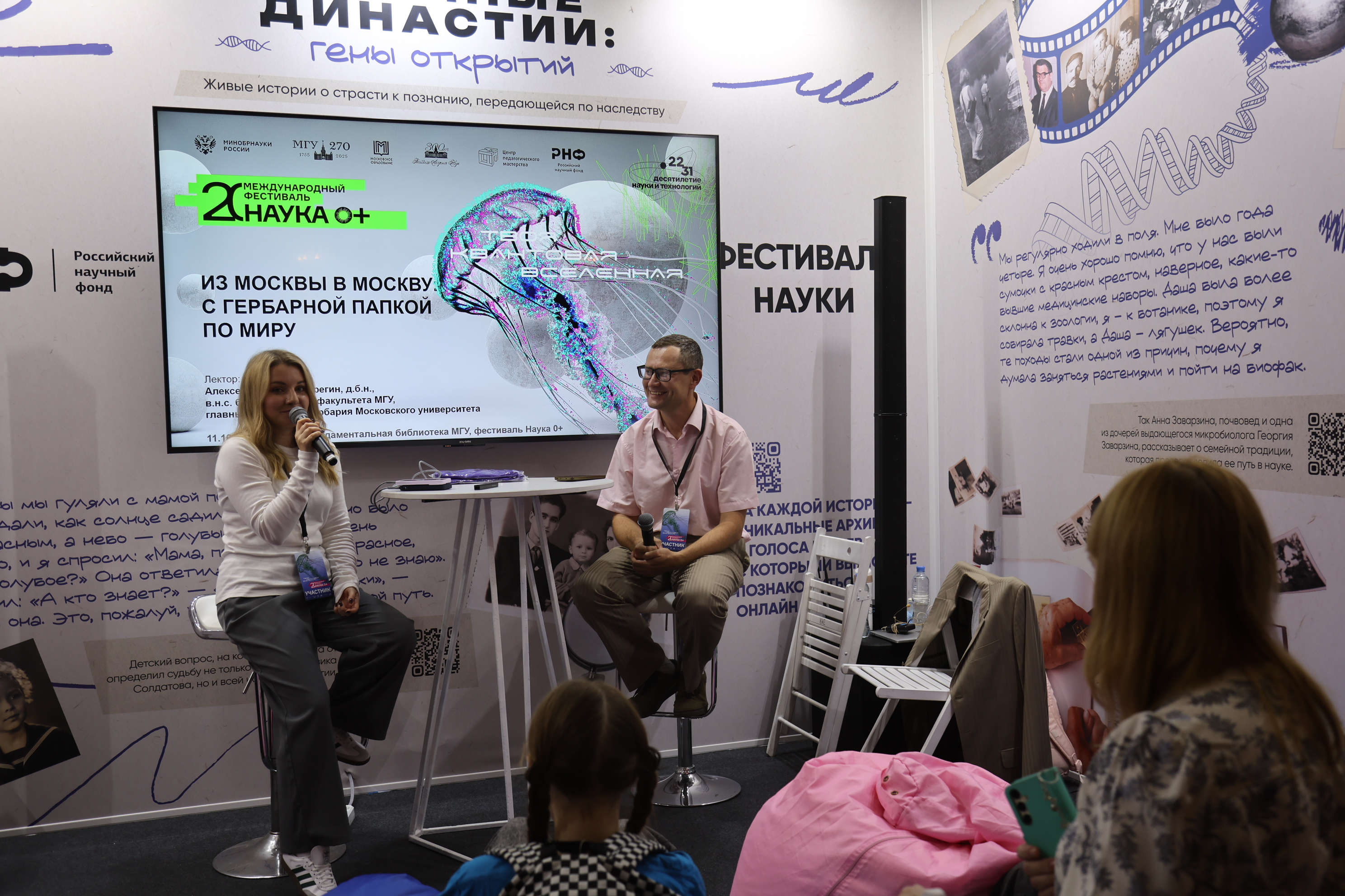 Особая атмосфера царила во время публичных интервью «Ученый на связи 0+». Алексей Серегин, ведущий научный сотрудник биофака МГУ имени М.В. Ломоносова, главный хранитель Гербария Московского университета, доктор биологических наук, рассказал об экспедициях, в которых можно обнаружить тысячи новых образцов растений, и о том, как семейная традиция может привести к выбору профессии. А палеонтолог Антон Колесников, заведующий лабораторией стратиграфии верхнего докембрия Геологического института РАН, поделился историями необычных находок возрастом более 500 млн лет и раскрыл научный прием: как отличить след древней жизни от обычного отпечатка на камне.