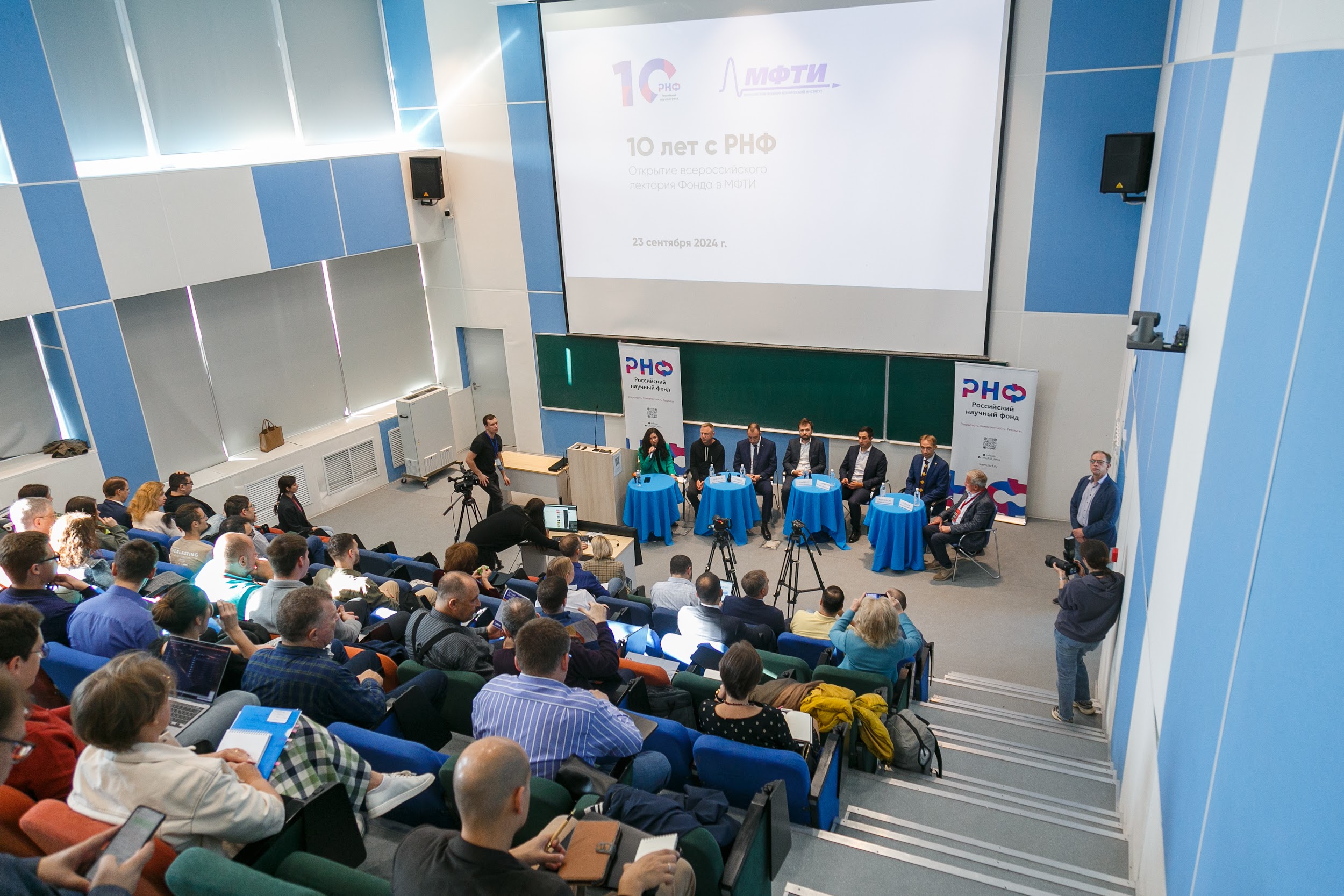 Спикерами круглого стола «Меры поддержки российской науки» стали заместитель генерального директора РНФ Андрей Блинов, ректор МФТИ Дмитрий Ливанов, председатель экспертного совета РНФ Валентин Анаников, директор Департамента государственной политики в сфере научно-технологического развития Минобрнауки Антон Шашкин, проректор МФТИ по научной работе Виталий Баган и заведующий лабораторией топологических квантовых явлений в сверхпроводящих системах Александр Голубов. Модератором беседы выступила Мария Михалева, заместитель начальника Управления программ и проектов – начальник отдела по связям с общественностью РНФ.