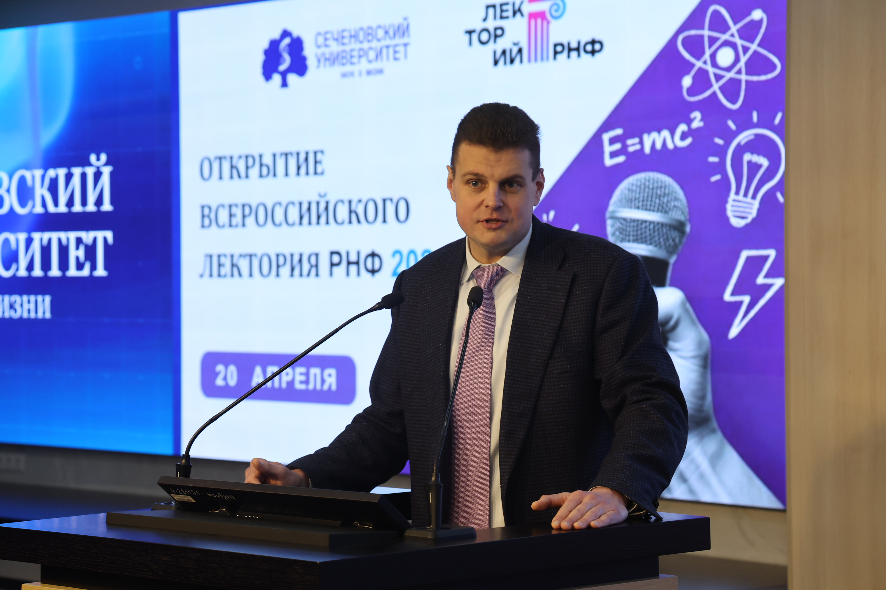 Далее участников приветствовал заместитель генерального директора РНФ Андрей Блинов. Он поблагодарил руководство и научное сообщество Сеченовского Университета за гостеприимство и проведение церемонии открытия. Андрей Блинов отметил, что Всероссийский лекторий РНФ за несколько лет стал флагманским проектом Фонда. Сегодня это уже не просто серия лекций, а большое общее дело, объединяющее сотни городов, научных организаций и тысячи участников по всей стране.«Всероссийский лекторий РНФ — за три года превратился в крупное мероприятие. И он организован не только для общения молодых и зрелых ученых, передачи опыта или рассказа о новых исследованиях. Мы активно привлекаем самых юных участников — школьников. В рамках Лектория они могут прикоснуться к науке, познакомиться с передовыми исследованиями и в будущем, возможно, выбрать свой научный путь».
