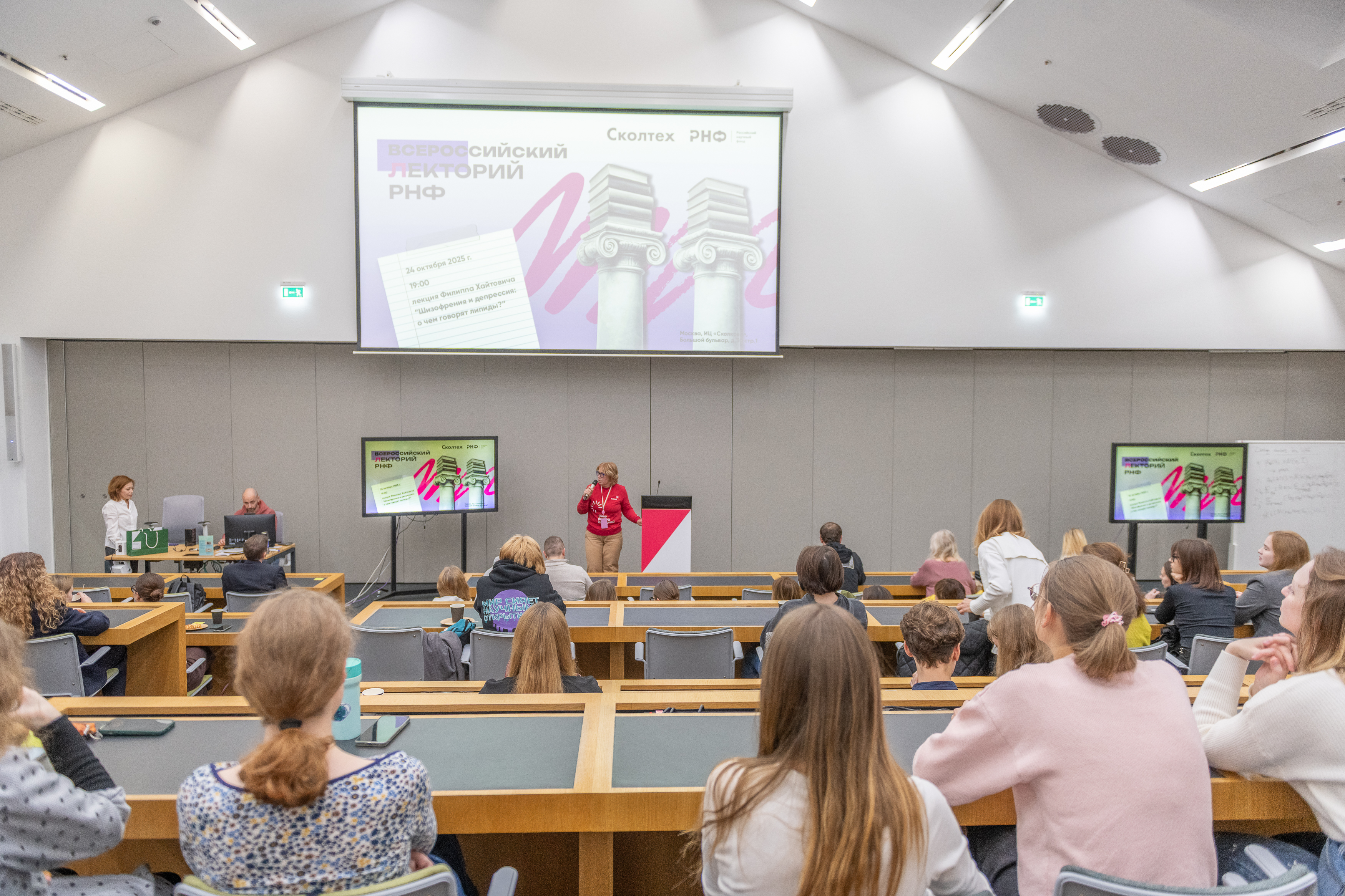 «Сколтех из года в год поддерживает инициативу Фонда и участвует во Всероссийском лектории РНФ. Тема исследования профессора нейроцентра Сколтеха Филиппа Хайтовича, посвященного изменениям липидома мозга при депрессии и шизофрении, вызвала настоящий ажиотаж у публики. Приятно было видеть в зале много молодых лиц, представителей медицинских университетов и компаний. После лекции состоялась оживленная Q&A-сессия, а потом дискуссия переместилась в кулуары, где участники продолжили нетворкинг и обмен мнениями. Самые активные слушатели, задавшие лучшие вопросы, получили брендированные сувениры, а главным призом стала книга «Разговоры за жизнь» — совместный проект Сколтеха и РНФ», — рассказала Полина Елизарова, менеджер проектов Департамента коммуникаций Сколтеха, куратор научно-популярных проектов.