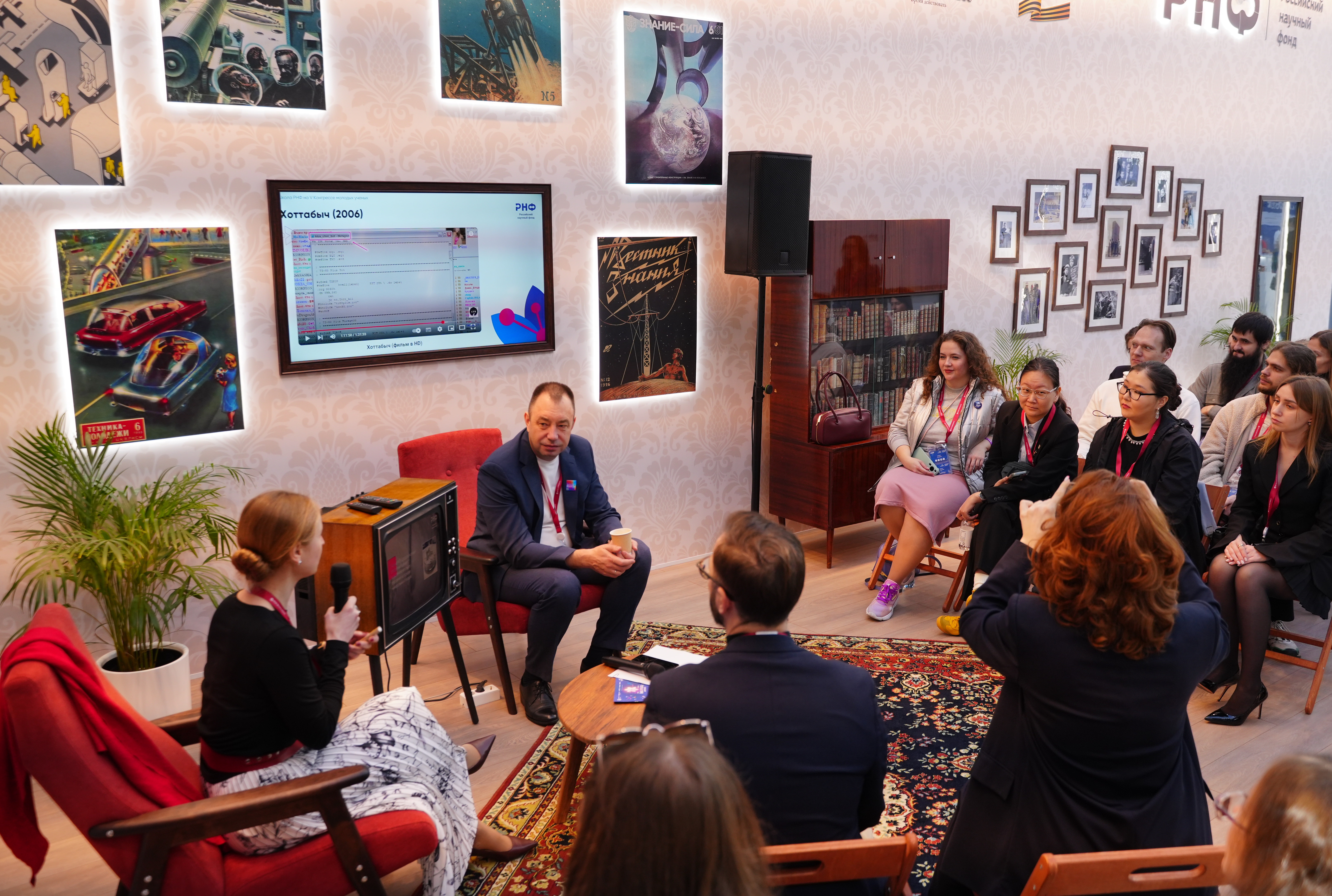 Программа интерактивного стенда РНФ 28 ноября началась с научного завтрака с заместителем генерального директора РНФ Андреем Блиновым и грантополучателем РНФ Юлией Алюниной, кандидатом филологических наук, старшим преподавателем и научным сотрудником кафедры иностранных языков филологического факультета РУДН. Формат привлек большое внимание участников, поскольку был посвящен кинематографу. Спикеры поговорили о том, как фантастическое кино задает вектор науке, на примере популярных картин.