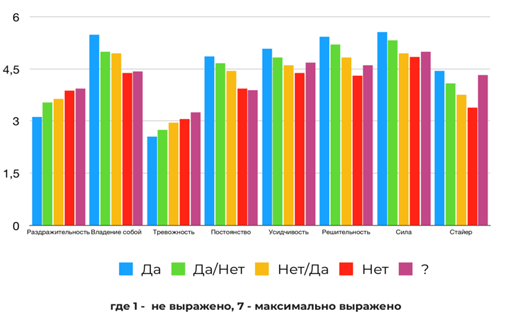 Интересными также оказались результаты самооценки тех же респондентов по их психологическим особенностям: