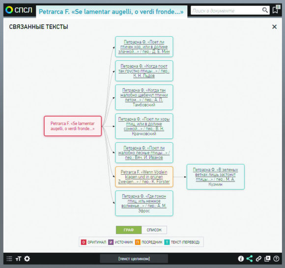 Корпус содержит поэтические произведения, переведенные на русский язык с французского, итальянского и испанского, их оригиналы и переводы-посредники на немецкий, английский и другие языки. Кроме того, в систему добавляются и более старые (греческие, римские) тексты, которые были источниками романских оригиналов русских переводов (как, например, оригиналы текстов из древнегреческой антологии, переведенные Вольтером). Поэтому в корпусе выделяются четыре типа текста: T = перевод, O = оригинал, П = посредник, И = источник. Они не просто загружены в систему — связи между ними эксплицированы и представлены в виде кластеров (пучков отношений). Визуализированные ссылки генерируются автоматически на основе соответствующих метаданных. Они представлены в виде списка и в виде графа. Например, можно посмотреть историю переводов 279-го сонета Петрарки. Помимо русских переводов, в кластер включен немецкий текст-посредник: один из переводчиков, М. Кузмин, переводил текст не с итальянского оригинала, а с немецкого перевода. Ссылки вызываются нажатием кнопки «отношения» на панели инструментов. Имеется возможность параллельного просмотра (связанные тексты могут быть загружены в левое или правое окно). Но это еще не всё: пользователю интересно понять, например, почему Кузмин, прекрасно знавший итальянский язык, переводил Петрарку с немецкого. Об этом можно узнать из статьи П. В. Дмитриева, опубликованной в 1996 году в «Новом литературном обозрении». Эта статья включена в электронную библиотеку СПСЛ, а между нею и текстами в Корпусе установлены связи. Эти связи (они вызываются нажатием соответствующей кнопки на панели управления) семантизированы: пользователь не просто видит гиперссылки, а понимает, что одна из них ведет от текста в Корпусе к комментированному изданию этого текста в Библиотеке; другая — непосредственно к комментарию; третья — к научной статье или монографии об этом тексте и к конкретным страницам, на которых о нем говорится; четвертая — от научной статьи к конкретным стихотворным текстам, которым она посвящена, и т. д.