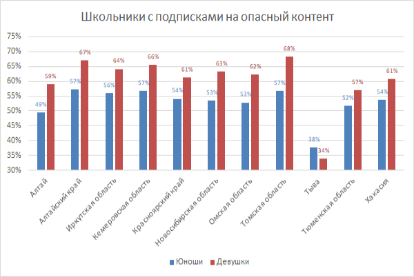 «В сравнении с другой возрастной категорией – со студентами, например – показатель таких подписок у школьников оказался выше. Среди студенчества он составляет в среднем около 42%. Как гипотеза, это может быть связано с уровнем образования и зрелостью личности. Даже на примере нашей выборки старшеклассников мы увидели такую корреляцию: чем больше в их интересах познавательного и образовательного контента, тем меньше интереса к опасному контенту», – рассказывает старший преподаватель кафедры гуманитарных проблем информатики, заведующий учебно-научной лабораторией компьютерных средств обучения ТГУ Артем Фещенко.