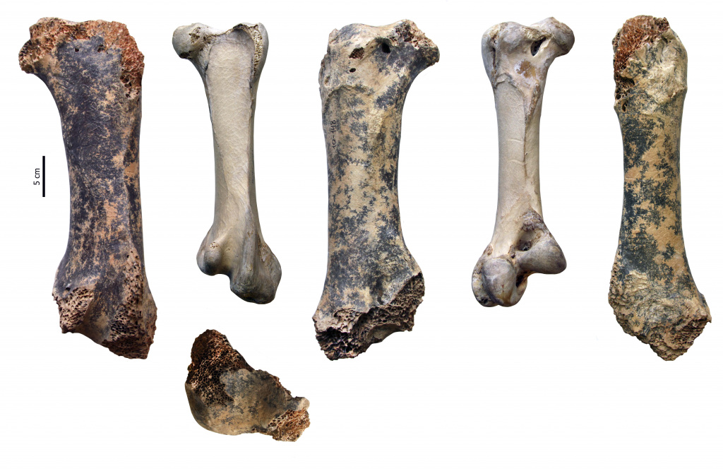 Фото: бедренная кость Pachystruthio в сравнении с таковой современного африканского страуса (разные ракурсы). Источник: Палеонтологический институт