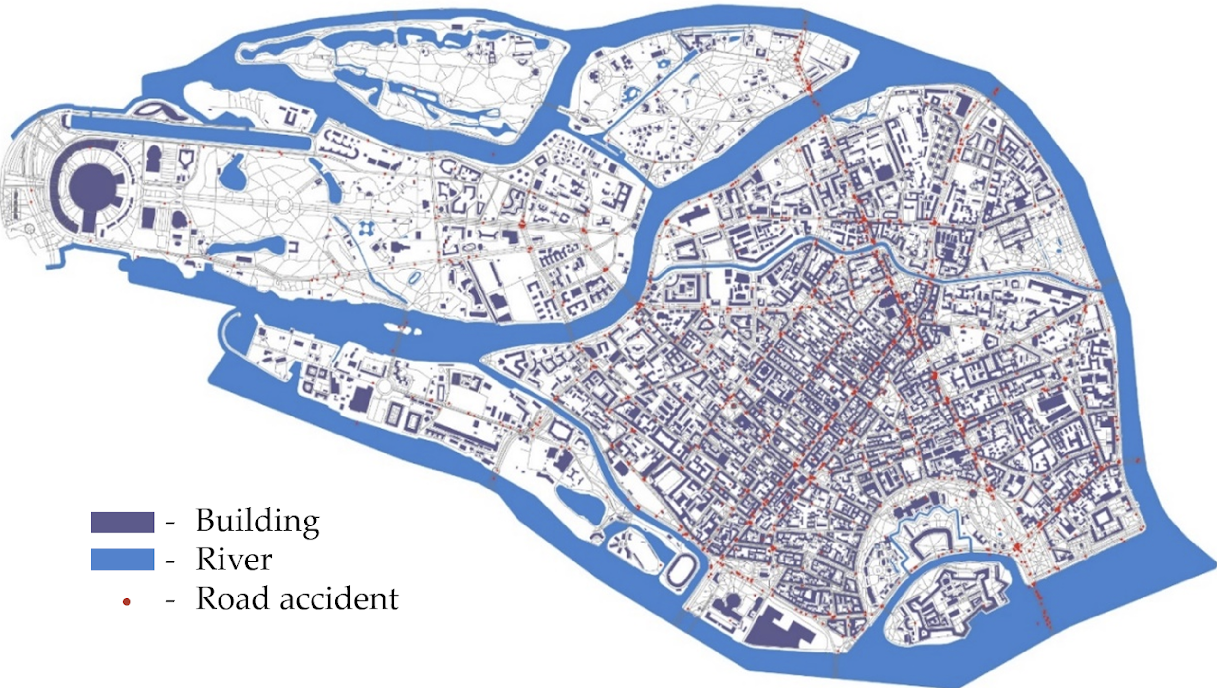 Петроградский район в Санкт-Петербурге в среде Rhino / Grasshopper с данными о зданиях, дорогах, реках и дорожно-транспортных происшествиях. Источник: Talipova et al / International Journal of Technology, 2025