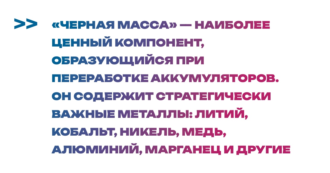 Процесс утилизации аккумуляторов сложен и включает много стадий. В первую очередь их необходимо собрать, отсортировать и разрядить. Затем следует механическое вскрытие и разделение компонентов с помощью различных методов сепарации, включая магнитную. В результате остается так называемая «черная масса» — наиболее ценный компонент, образующийся при переработке бывших в употреблении аккумуляторов, содержащий стратегически важные металлы: наиболее востребованные литий и кобальт, а также никель, медь, алюминий, марганец и другие.