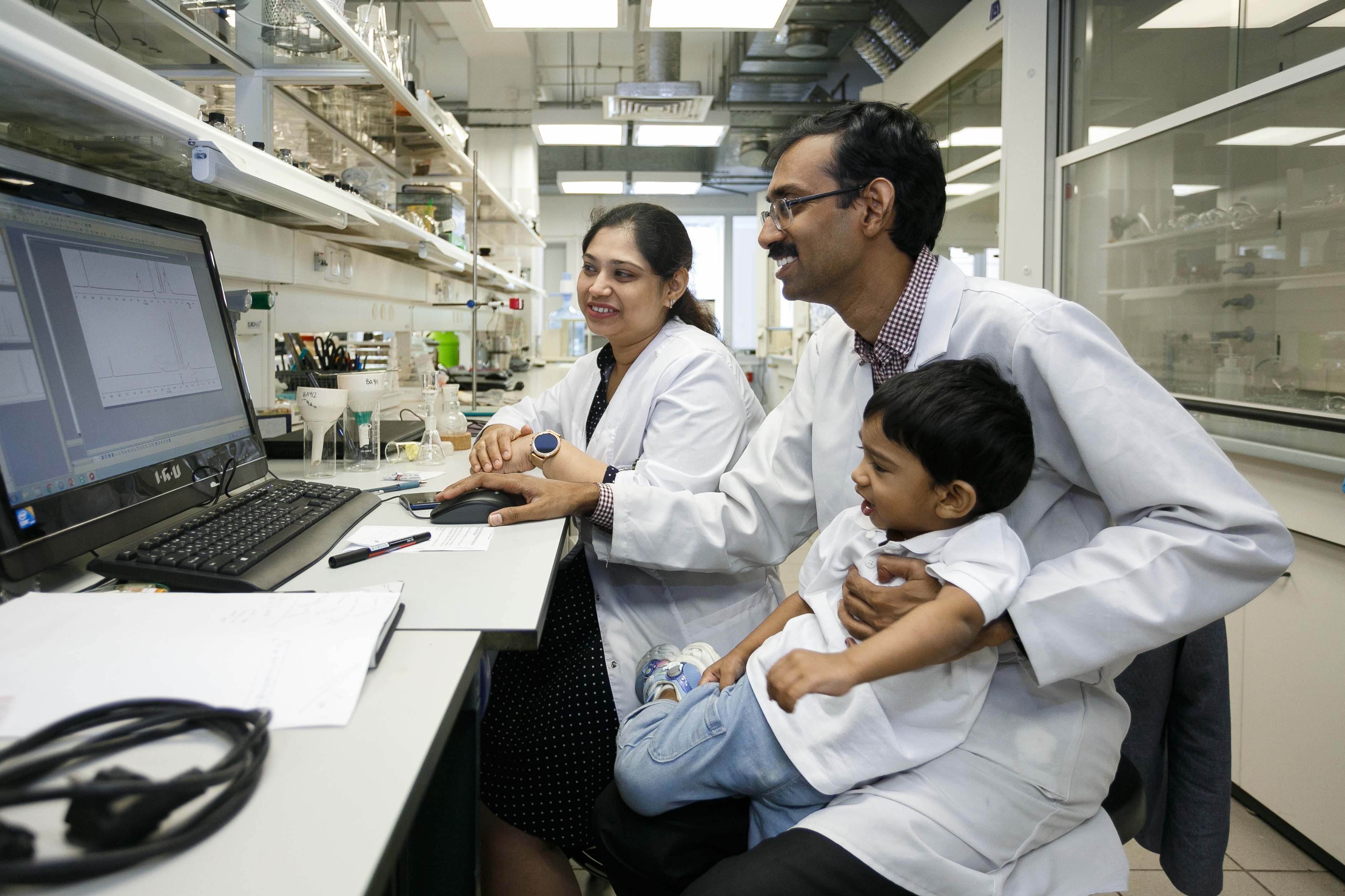 Согата Сантра с женой и сыном в лаборатории. Источник: Пресс-служба РНФ