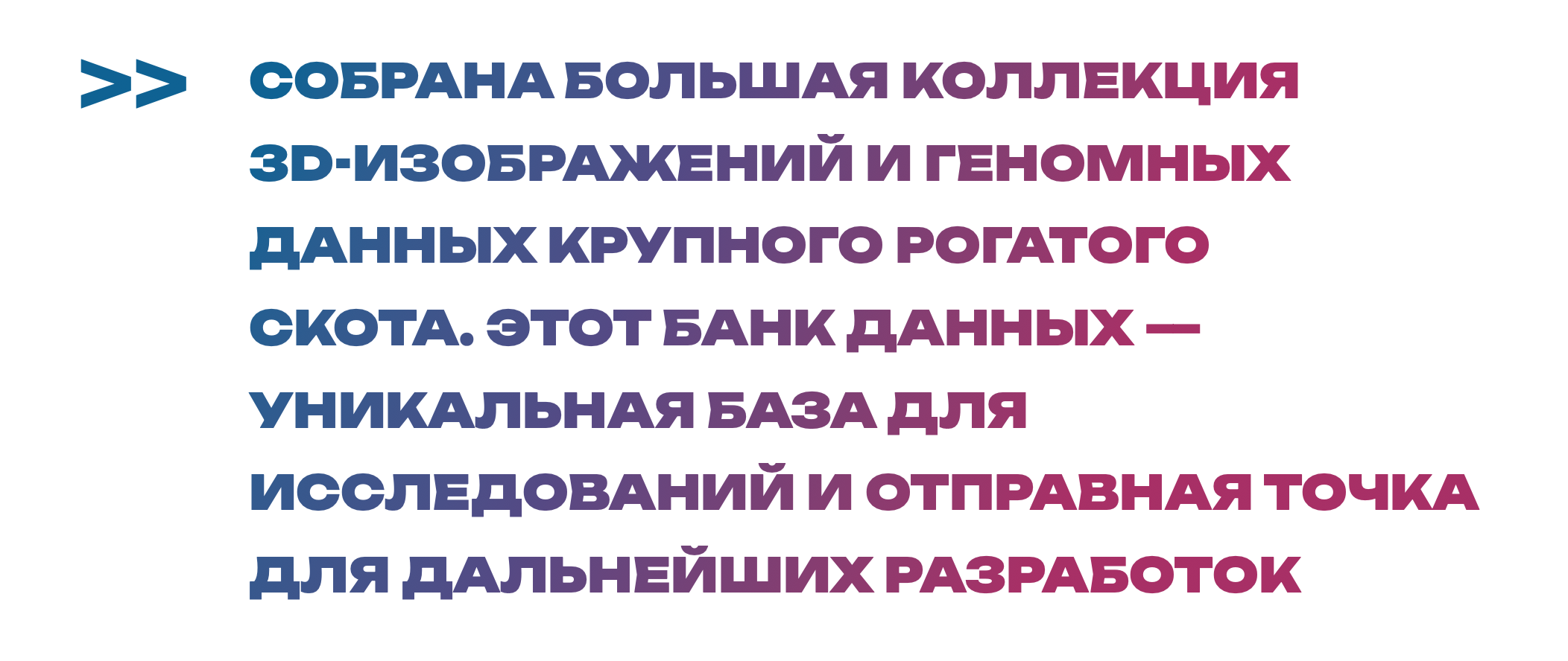 Наша группа собрала большую коллекцию 3D-изображений и геномных данных крупного рогатого скота. Этот банк данных стал уникальной базой для последующих исследований и отправной точкой для дальнейших разработок. Через полногеномные ассоциативные исследования (GWAS) мы выявили ряд генетических вариантов, которые сильно влияют на продуктивность животных. Эти данные будут полезны при селекции и выборе лучших особей для размножения.