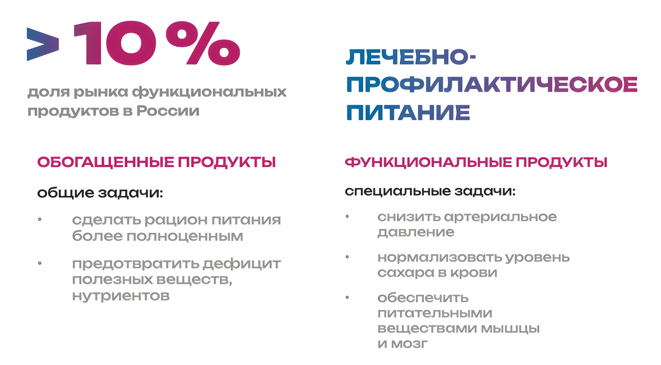 Я бы все-таки говорила не о здоровом питании, а о лечебно-профилактическом. Технологи выделяют обогащенные и функциональные продукты. К первым относят продукты с добавлением витаминов, минеральных веществ, клетчатки. Они делают рацион более полноценным, предотвращают дефицит полезных веществ нутриентов. Функциональные, или лечебные, продукты нужны для решения специальных задач: снизить давление или сахар в крови, обеспечить питательными веществами мышцы или мозг.