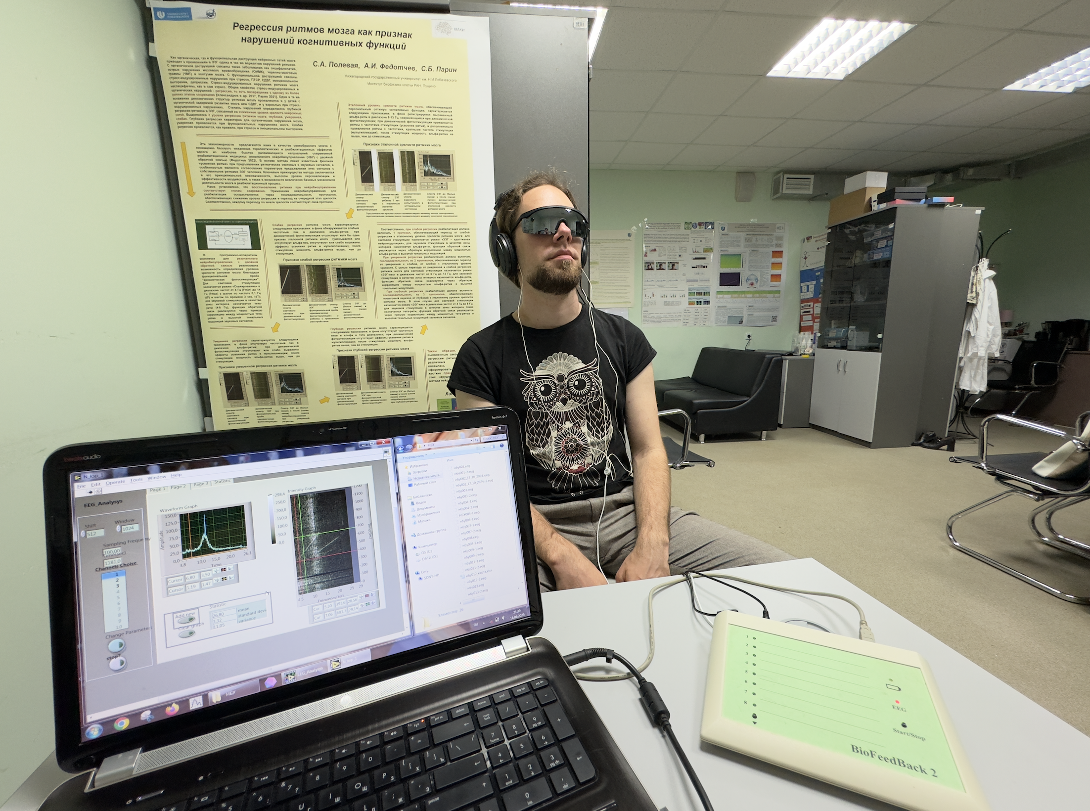 Сеанс нейробиоуправления на программно-аппаратном комплексе Biofeedback, сконструированном в Институте биофизики клетки РАН. Источник: Иван Лоскот, Игорь Егоров, Данила Ронжин