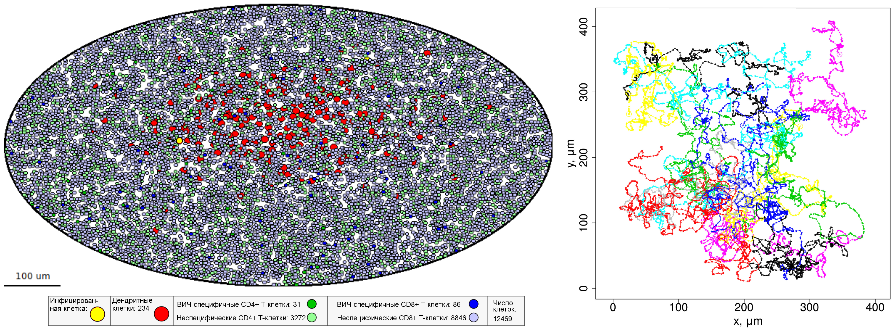 Картинка: слева: начальная конфигурация компьютерного эксперимента по моделированию движения иммунных клеток в лимфоузле, справа: пример траекторий движения 15 случайно выбранных лимфоцитов в течение 5 часов. Источник: Геннадий Бочаров