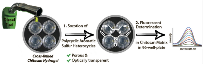 В таких датчиках комбинируется способность ковалентно сшитого хитозана сорбировать ПАГС, избирательно распознавать и улавливать последние, а также использовать оптическую прозрачность материалов для твердофазного определения дибензотиофенов. Для скрининга ПАГС в органических неполярных средах ортофталевый диальдегид оказался наиболее подходящим сшивающим агентом.