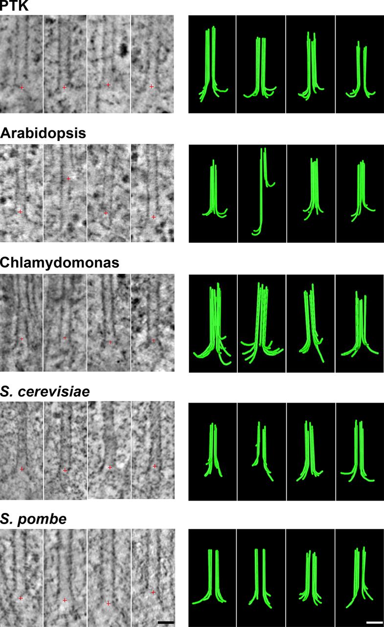 Картинка: электронные томограммы (слева) и реконструированные по ним модели растущих концов микротрубочек в различных организмах (справа): в животных клетках (РТК), в растительных (Arabidopsis), в одноклеточных водорослях (Clamidomonas) и в дрожжах (S. cerevisiae и S. pombe). Реконструкция предоставлена Никитой Гудимчуком.