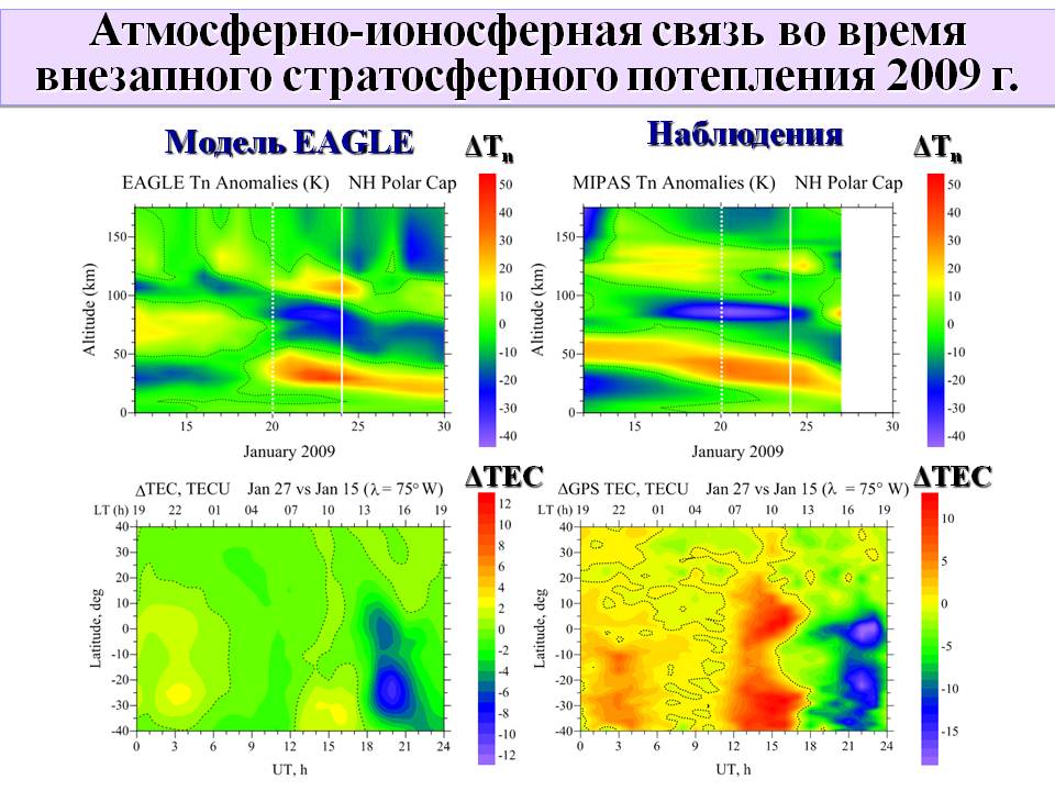 Внезапные стратосферные потепления –– крупные метеорологические явления, характеризующиеся разогревом зимней полярной стратосферы и появлением существенных аномалий, происходящих по всей атмосфере. Возмущения в полярной зимней стратосфере вызывают замедление или даже переворот полярного вихря (циркуляцию арктического воздуха в области пониженного давления вблизи полюсов), что приводит к значительному повышению полярных температур. Внезапные стратосферные потепления бывают примерно раз в два года, но событие января 2009 года стало одним из самых сильных. Кроме того, оно происходило на фоне низкого и не меняющегося со временем уровня солнечной и геомагнитной активности. Это дало возможность в наблюдениях выделить эффекты стратосферного потепления без влияния других явлений. Исследовав это уникальное событие, ученые показали связь изменений температуры верхней атмосферы в тропических широтах и аномального поведения полного электронного содержания ионосферы в области экватора. В этом же исследовании они впервые выявили и интерпретировали аномальное повышение электронного содержания ионосферы в вечернее время на экваториальных широтах во время стратосферного потепления.